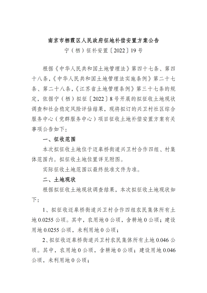 迈皋桥街道-宁(栖)征补安置〔2022〕19号-征地补偿安置方案公告-兴卫村社区综合服务中心(党群服务中心)