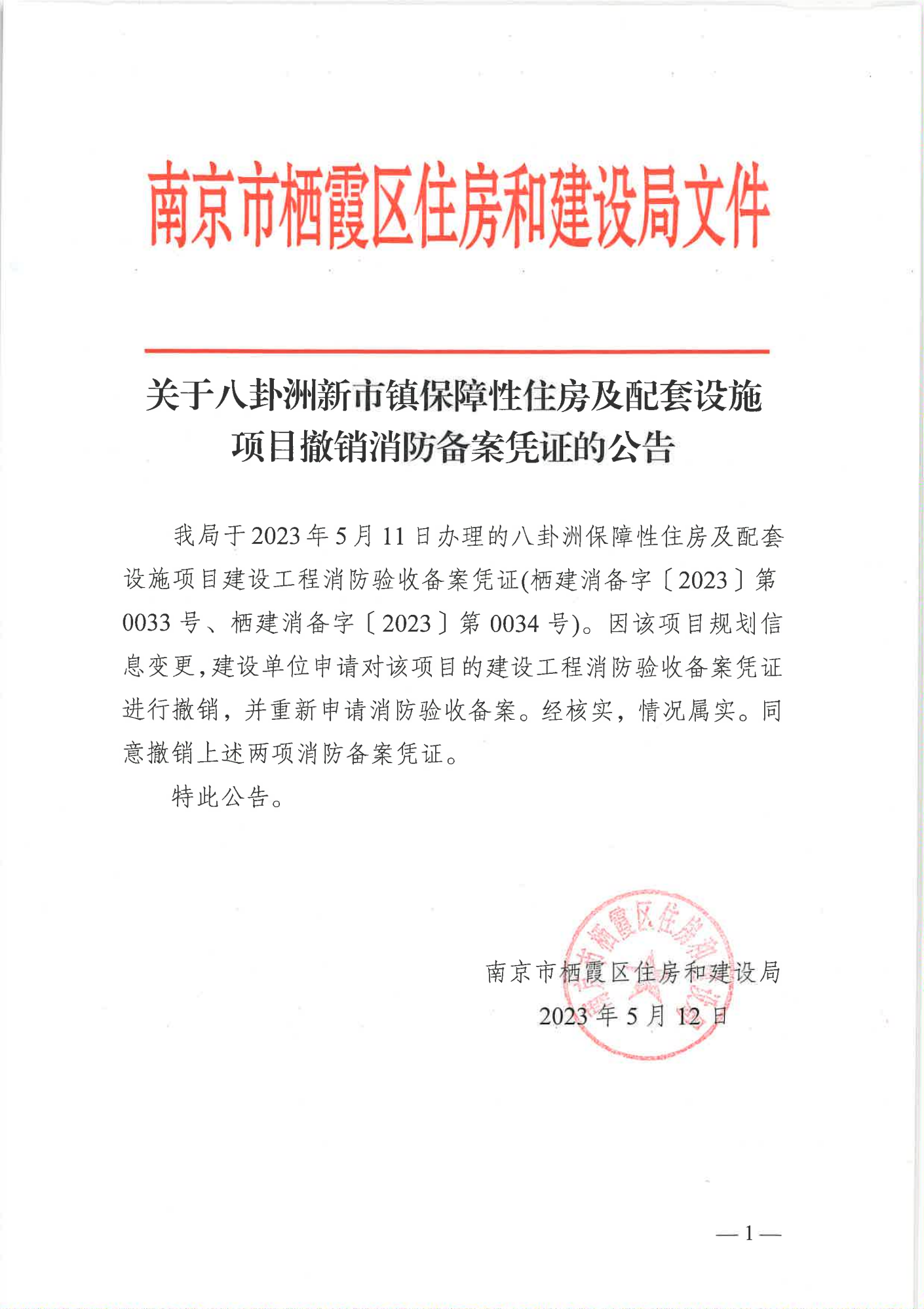 关于八卦洲新市镇保障性住房及配套设施项目撤销消防备案凭证的公告