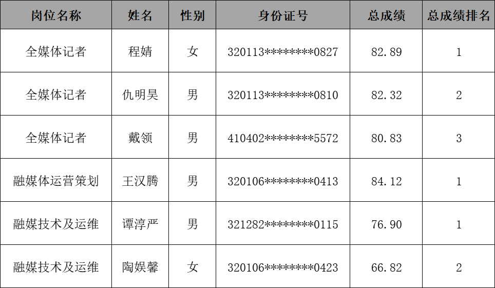 根据《南京市栖霞区融媒体中心2023年编外工作人员公开招聘简章》要求,经招聘简章公告、报名阶段、资格初审、笔试、资格复审、综合考核、体检及考察等程序,现将拟聘用人员名单公示如下: