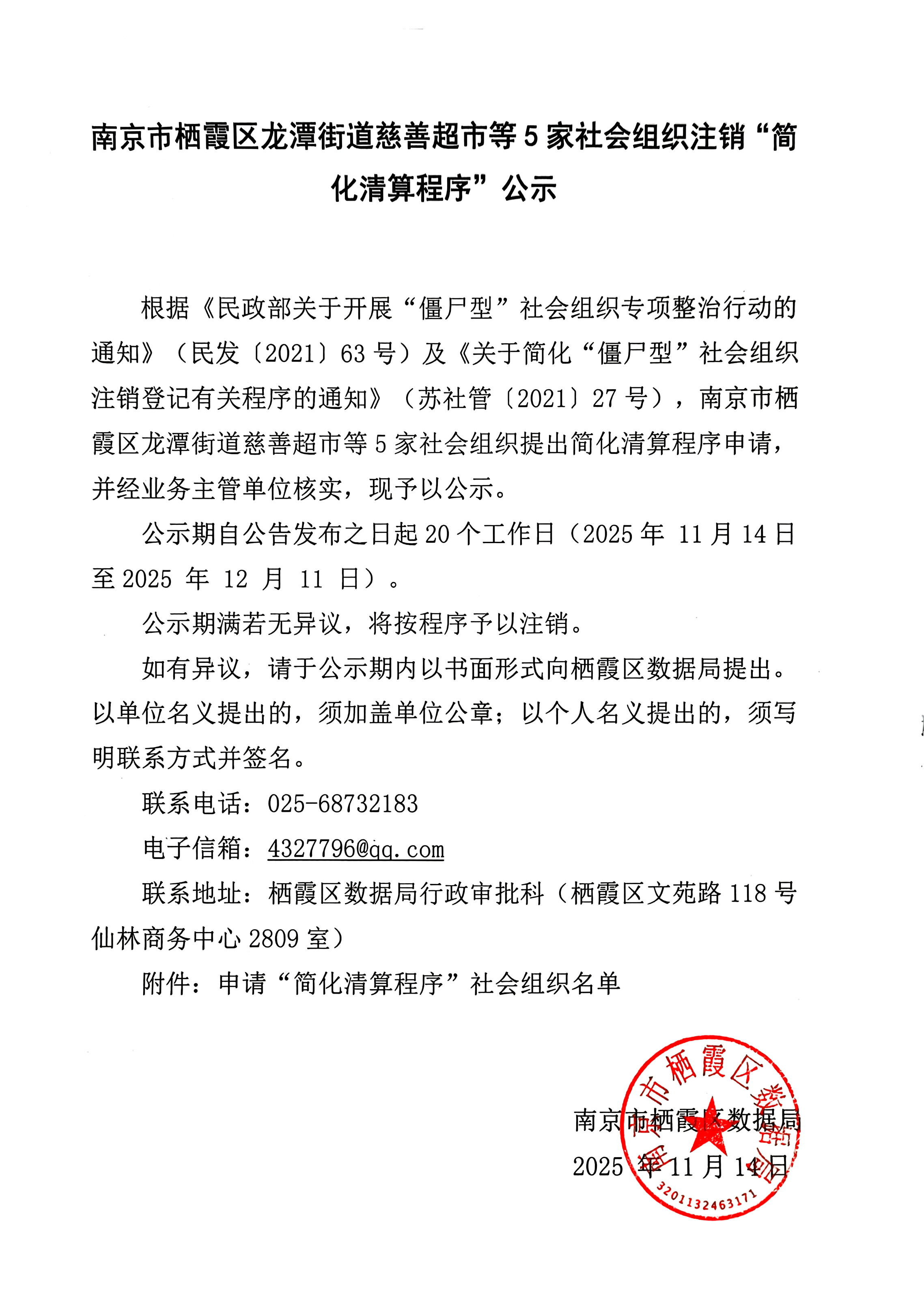 南京市栖霞区龙潭街道慈善超市等5家社会组织注销“简化清算程序”公示