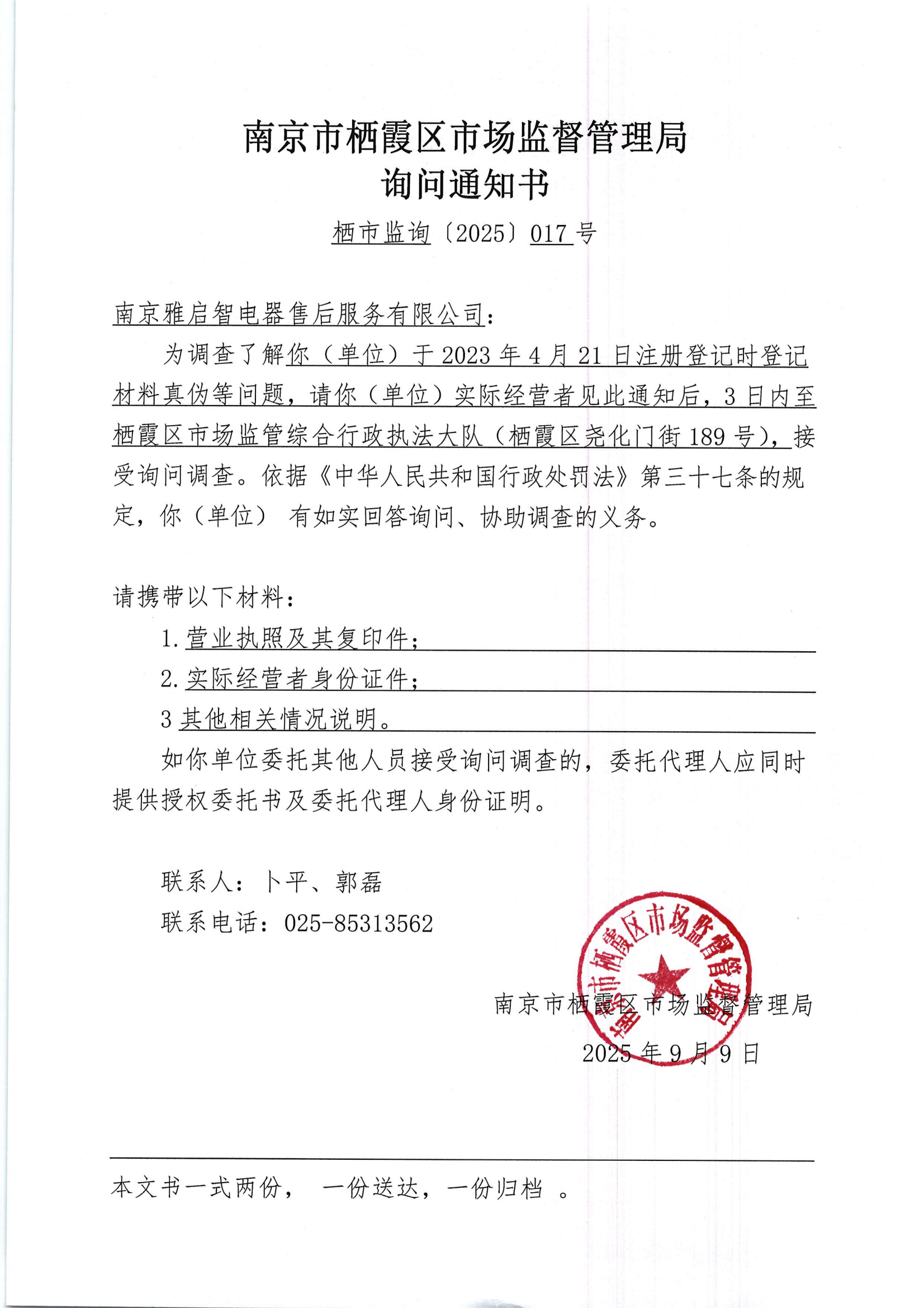 南京市栖霞区市场监督管理局询问通知书(南京雅启智电器售后服务有限公司)