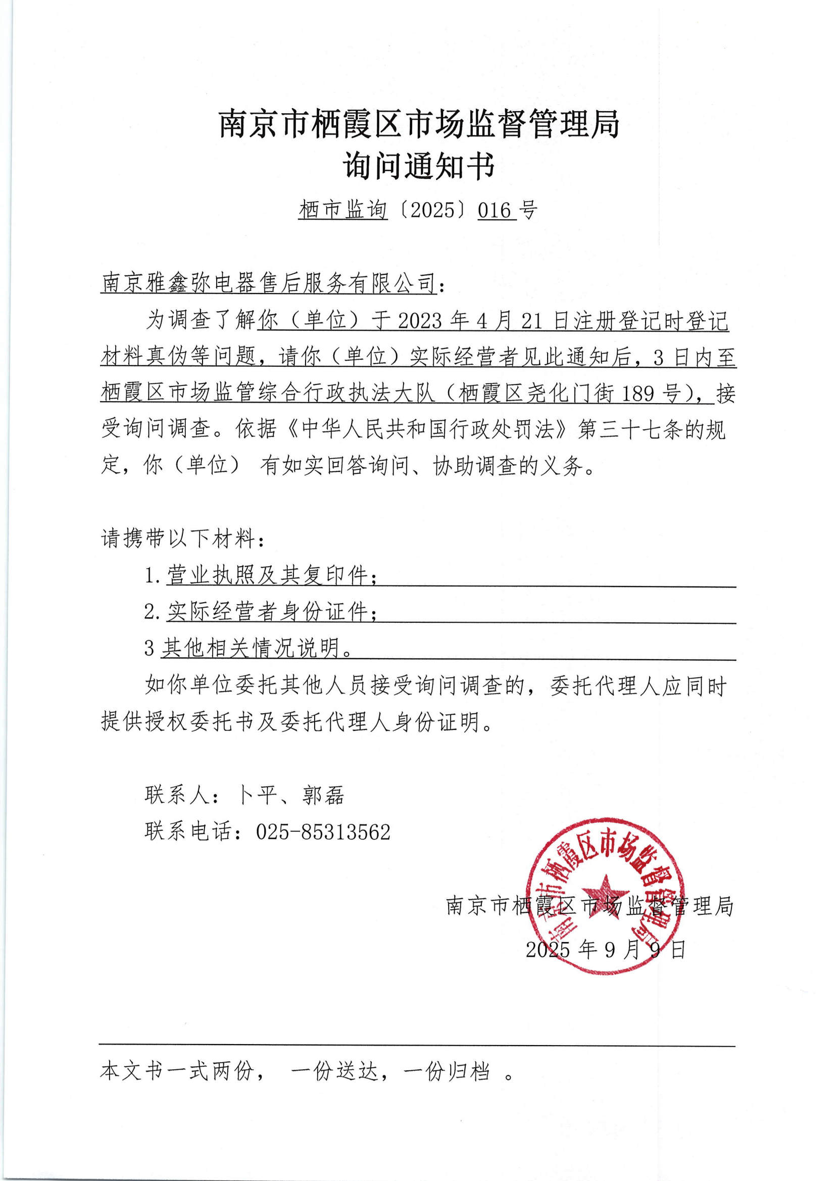南京市栖霞区市场监督管理局询问通知书(南京雅鑫弥电器售后服务有限公司)