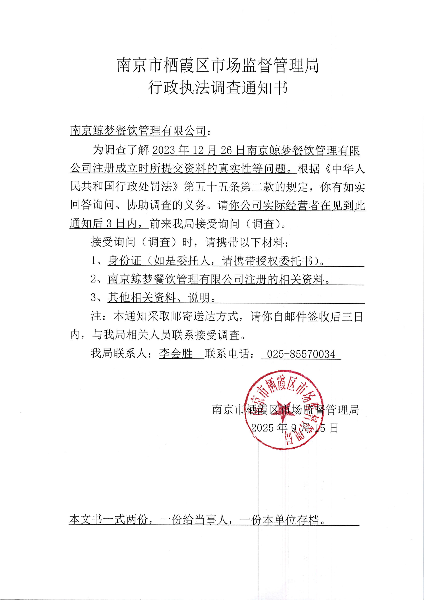 南京市栖霞区市场监督管理局行政执法调查通知书(南京鲸梦餐饮管理有限公司)