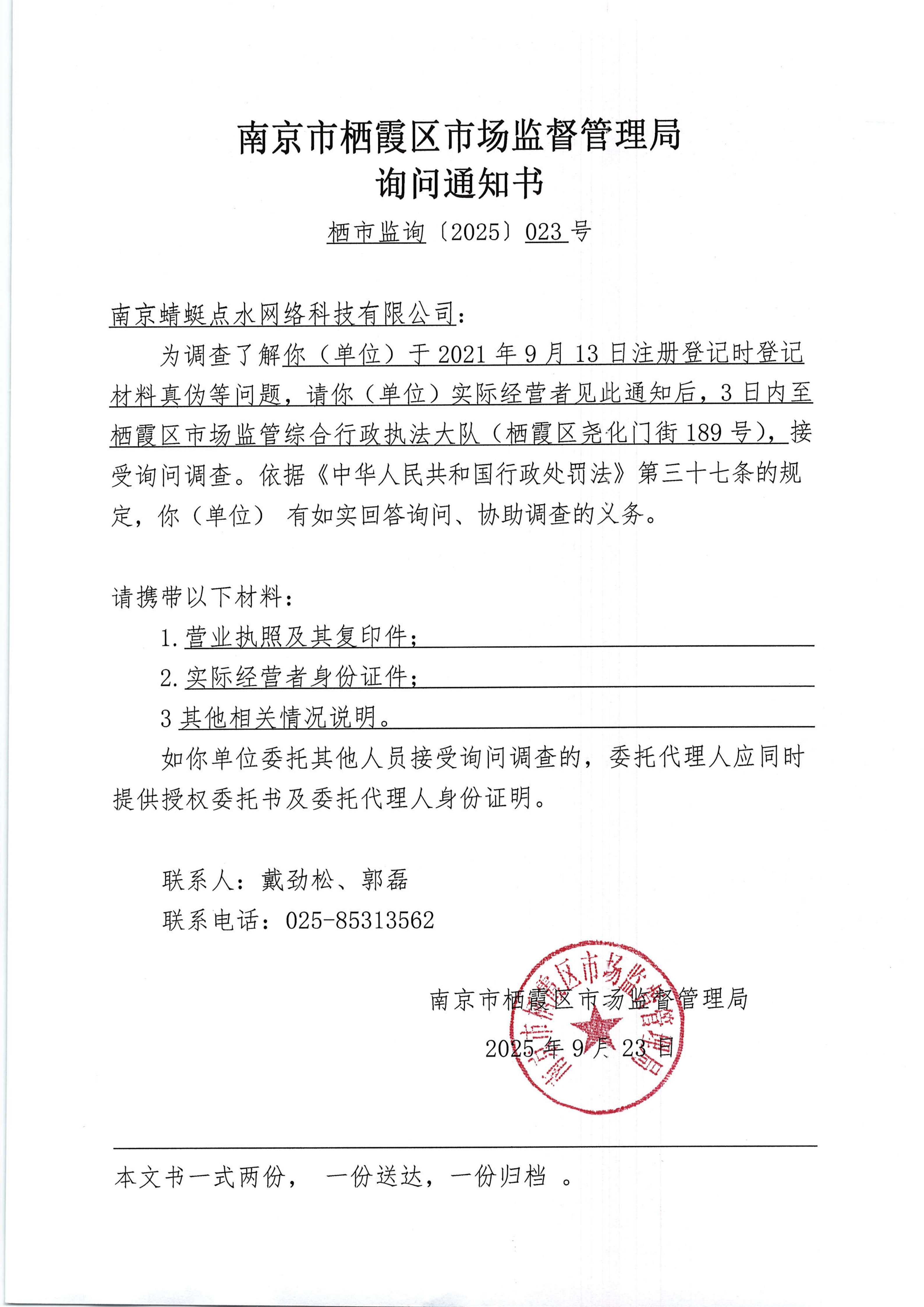 南京市栖霞区市场监督管理局询问通知书(南京蜻蜓点水网络科技有限公司)
