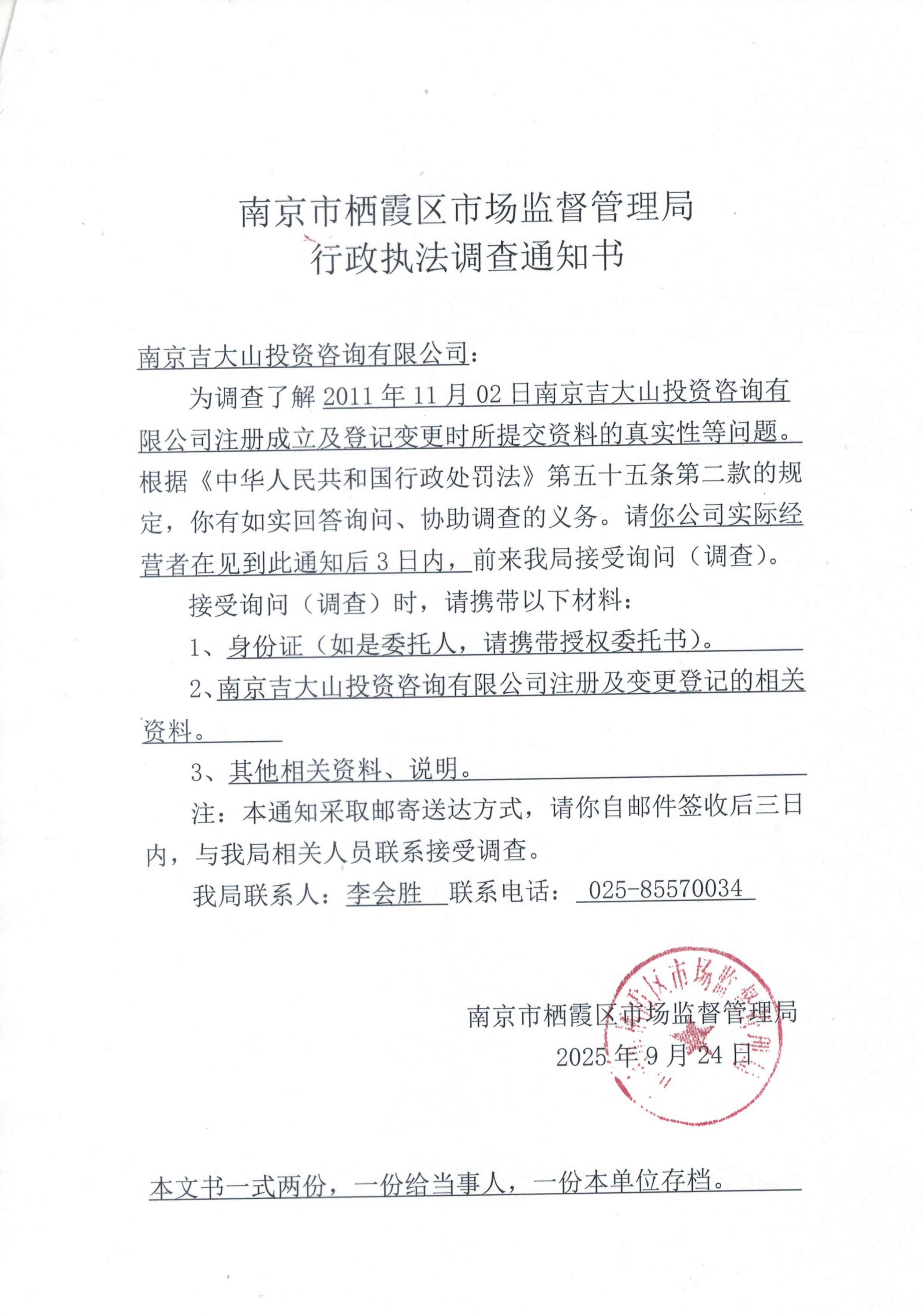 南京市栖霞区市场监督管理局行政执法调查通知书(南京吉大山投资咨询有限公司)