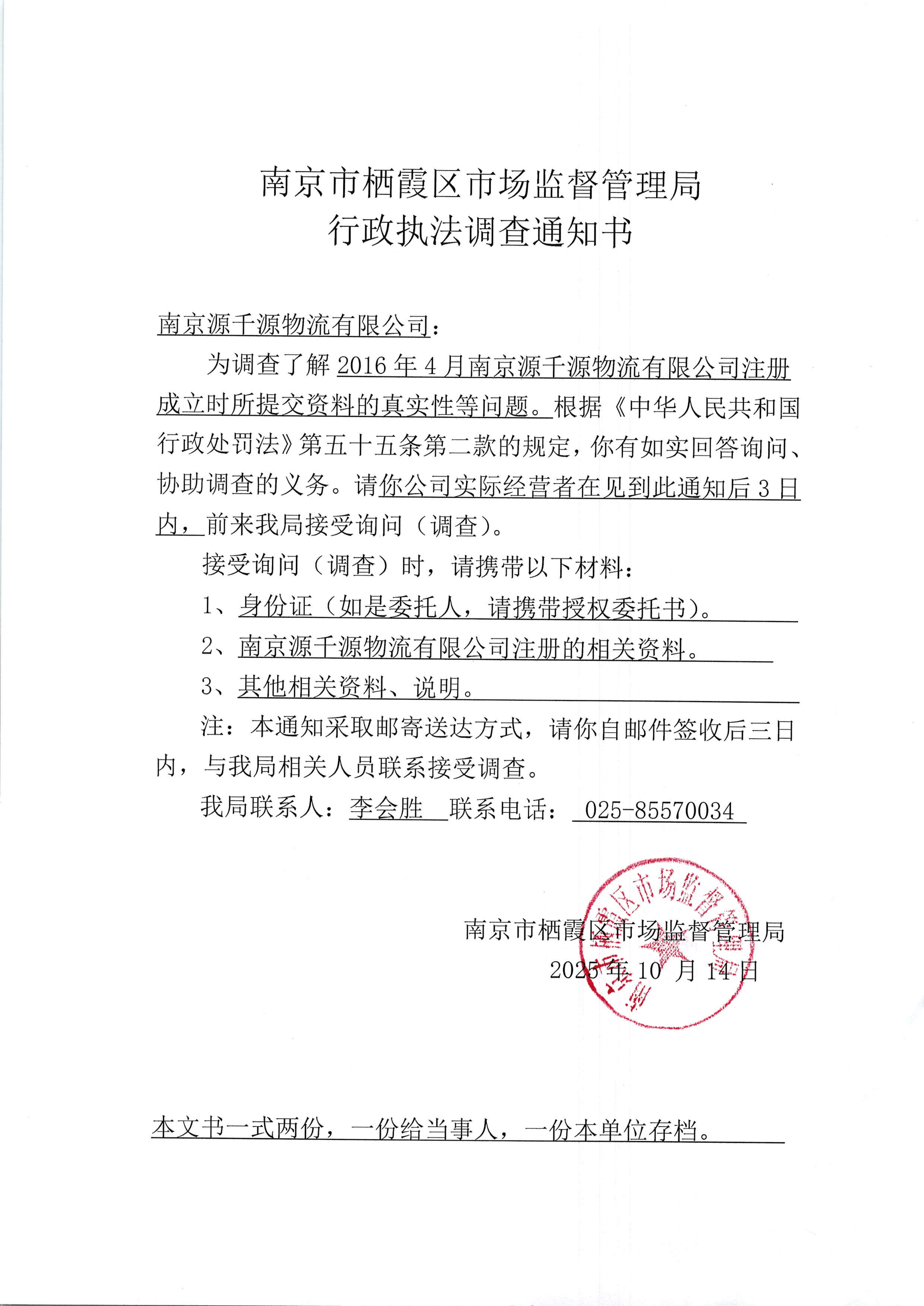 南京市栖霞区市场监督管理局行政执法调查通知书(南京源千源物流有限公司)