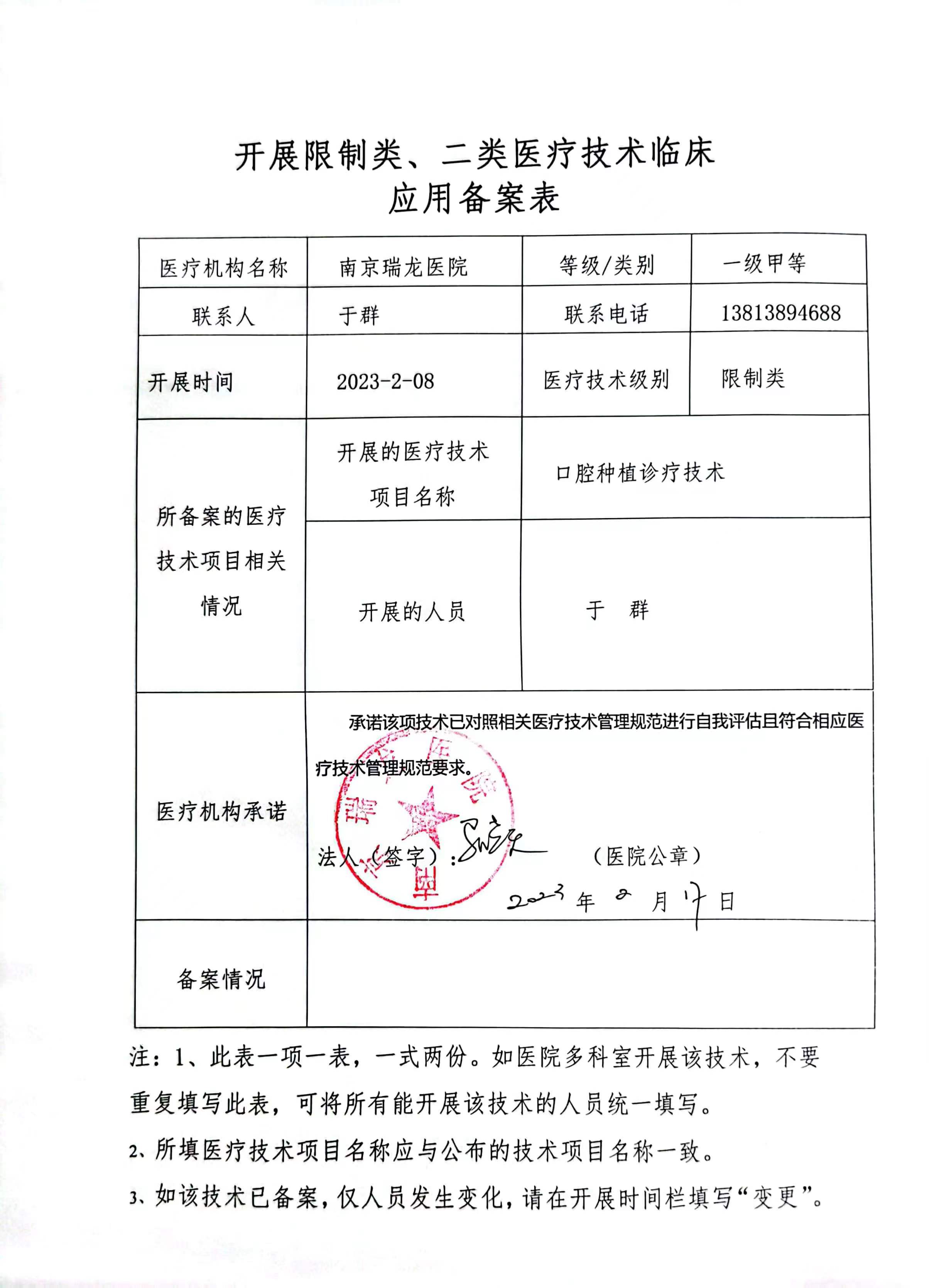 根据南京瑞龙医院提交的《开展限制类、二类医疗技术临床应用备案表》,我委受理了该备案申请,已进入备案程序,按照《医疗技术临床应用管理办法》文件要求,现将拟批准医疗技术备案单位基本情况公示如下: