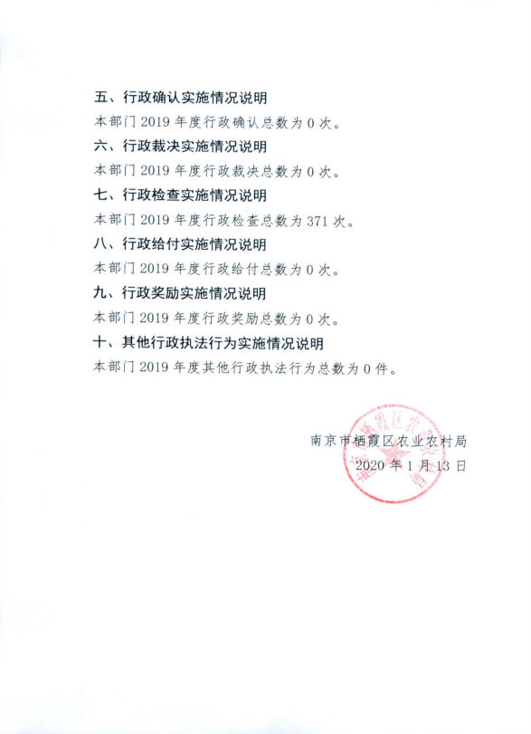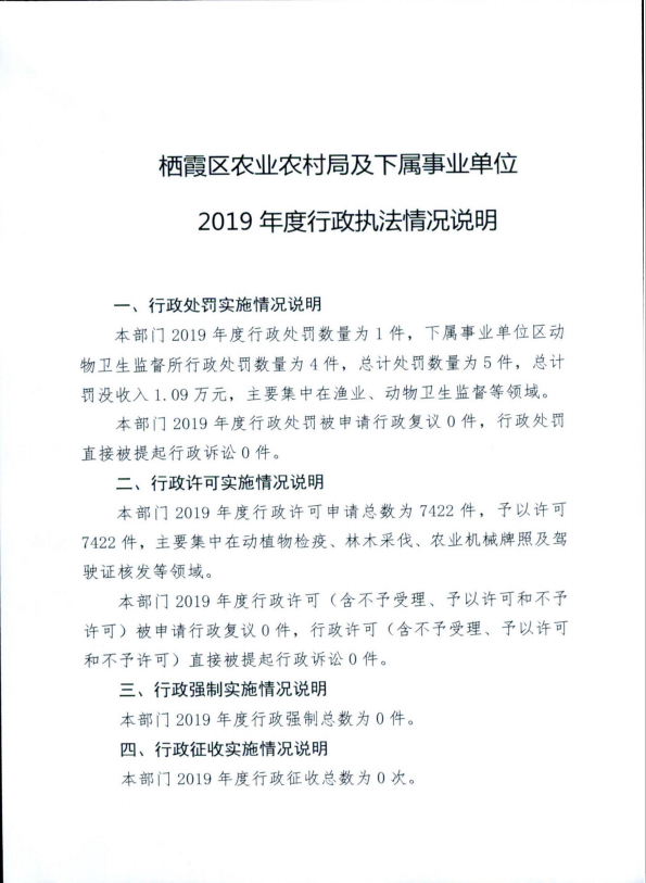 栖霞区农业农村局及下属事业单位2019年度行政执法情况说明