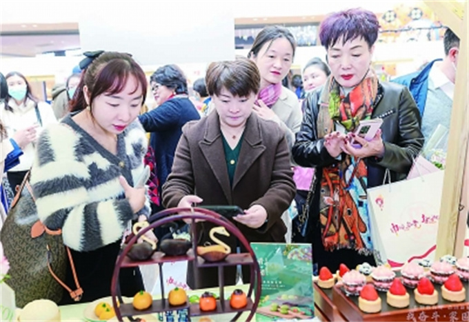 个巾帼特色展位,其中包含区女性科技企业展位,金箔、折扇、剪纸等非遗文化市集,现场“烟火气”十足。