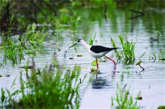 纤细的长腿,搭配着红色“皮靴”,一身黑袖白衣,身姿绰约、仪态蹁跹。偶眺望远方,笔直站立;偶低头啄食,水面嬉戏。氤氲水汽间,黑翅长脚鹬翩然飞舞。它扬起细长的嘴,舒展翅膀抖动着尾羽,“扑闪扑闪”地展翅翱翔,优雅之余还发出悦耳的鸣叫声。