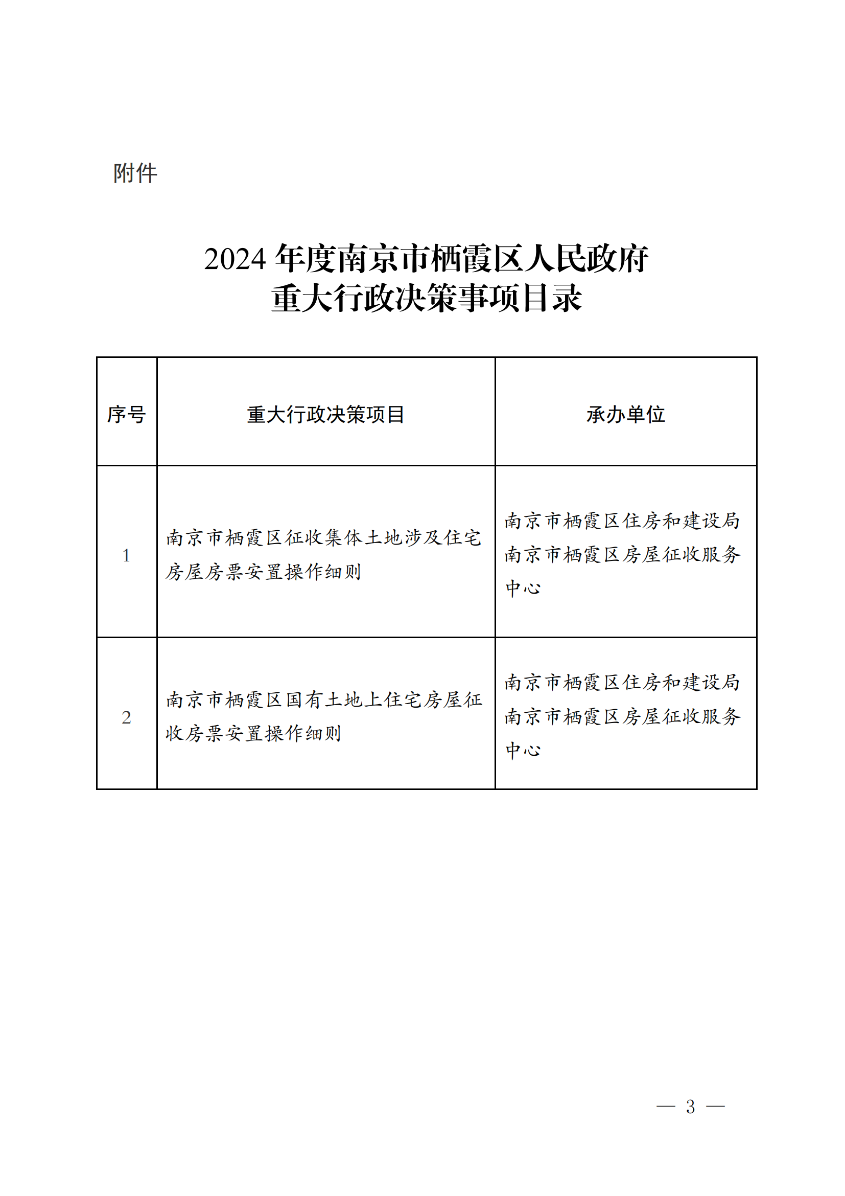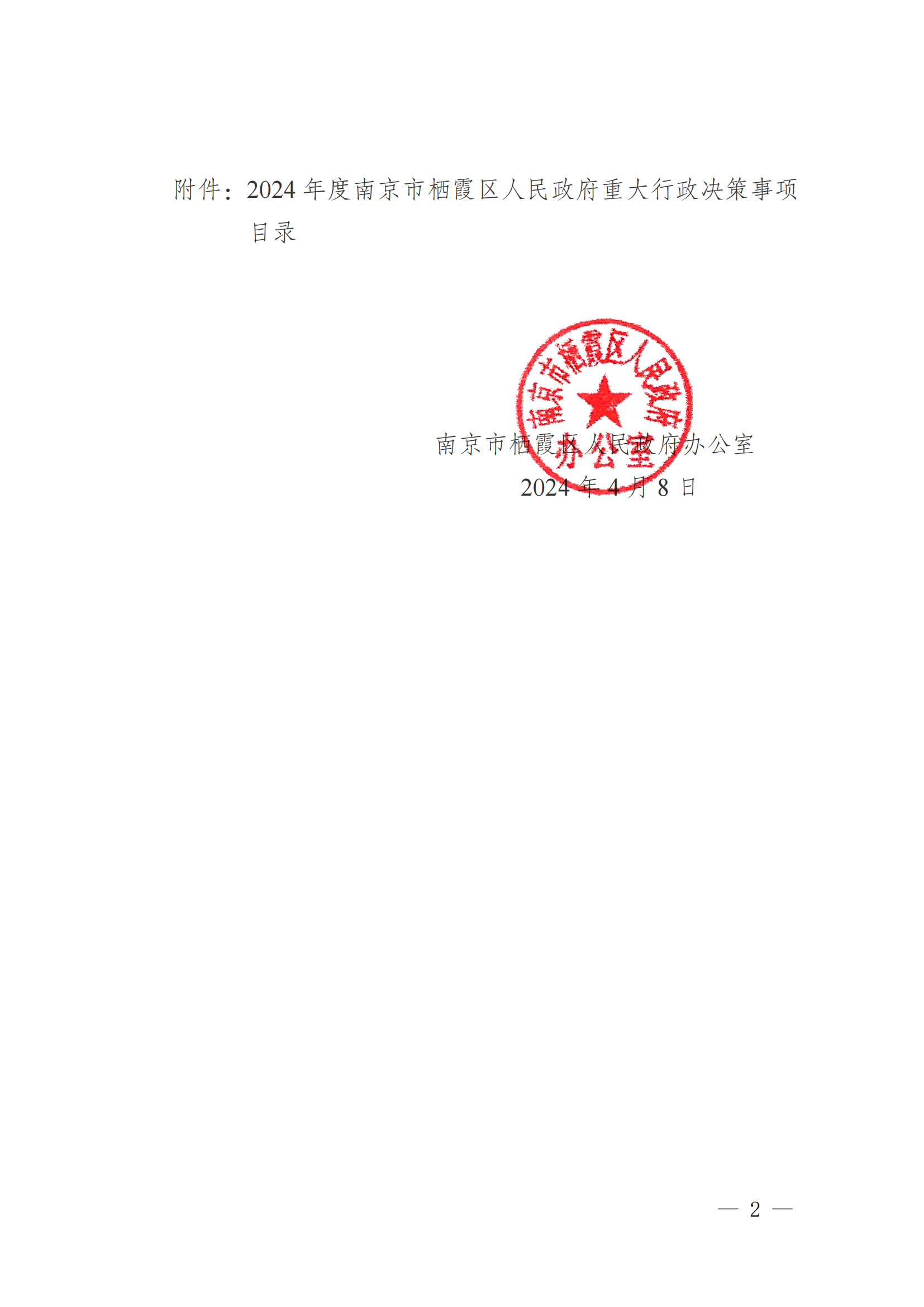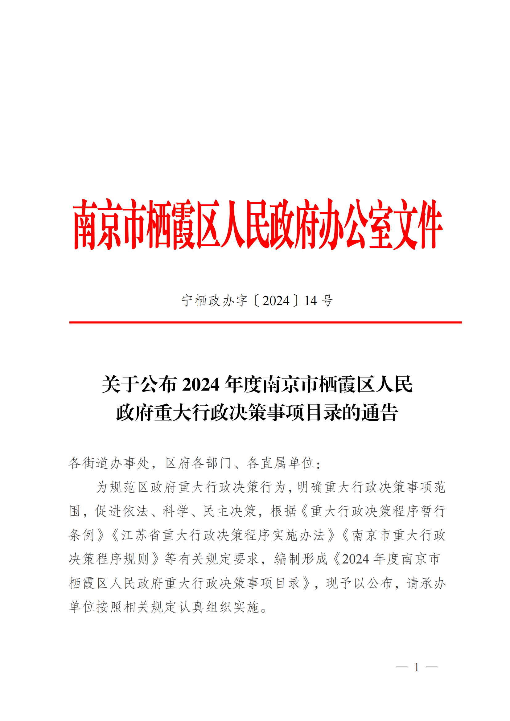 宁栖政办字〔2024〕14号 关于公布2024年度南京市栖霞区人民政府重大行政决策事项目录的通告