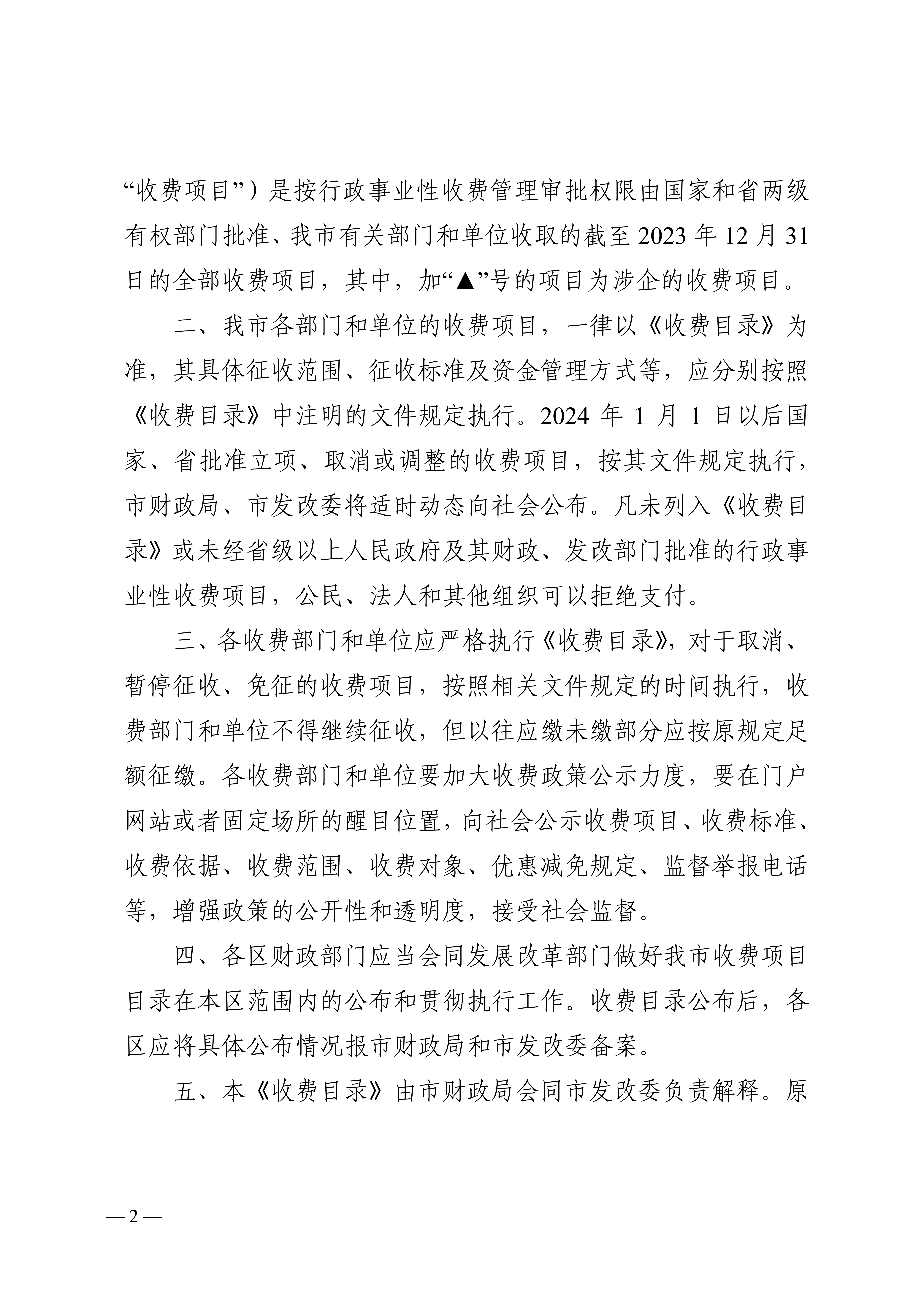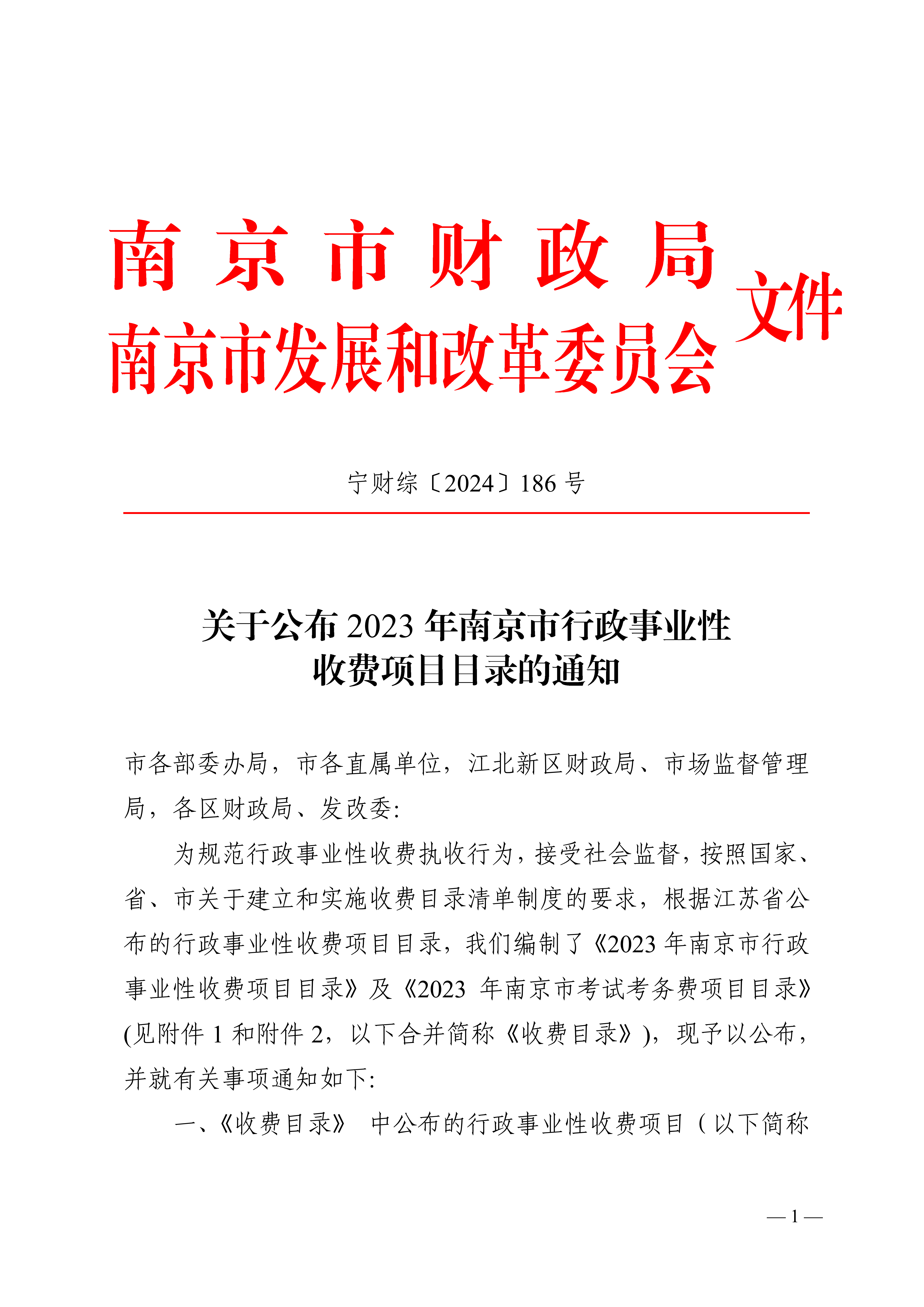关于公布2023年南京市行政事业性收费目录的通知(宁财综[2024])186号