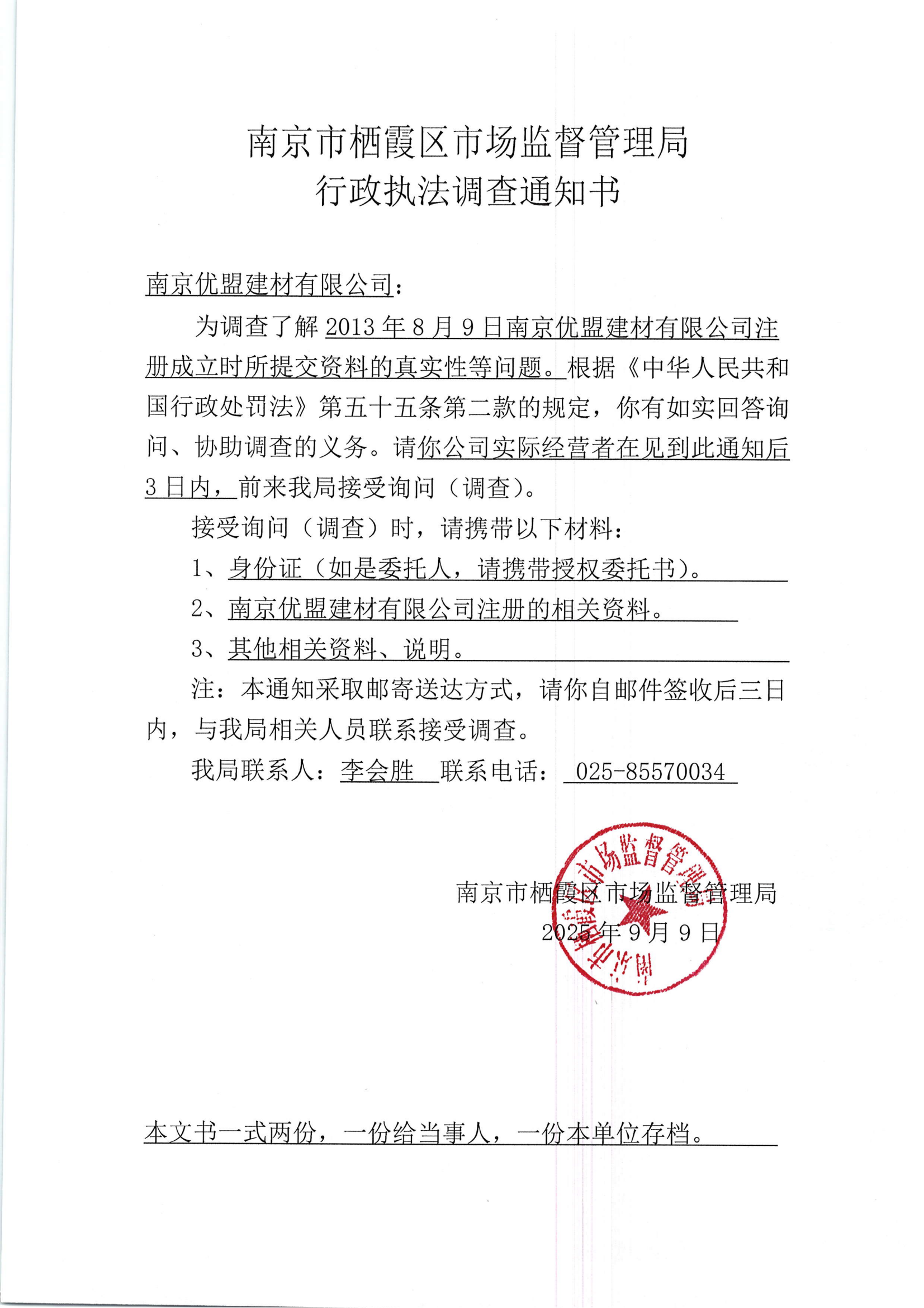 南京市栖霞区市场监督管理局行政执法调查通知书(南京优盟建材有限公司)