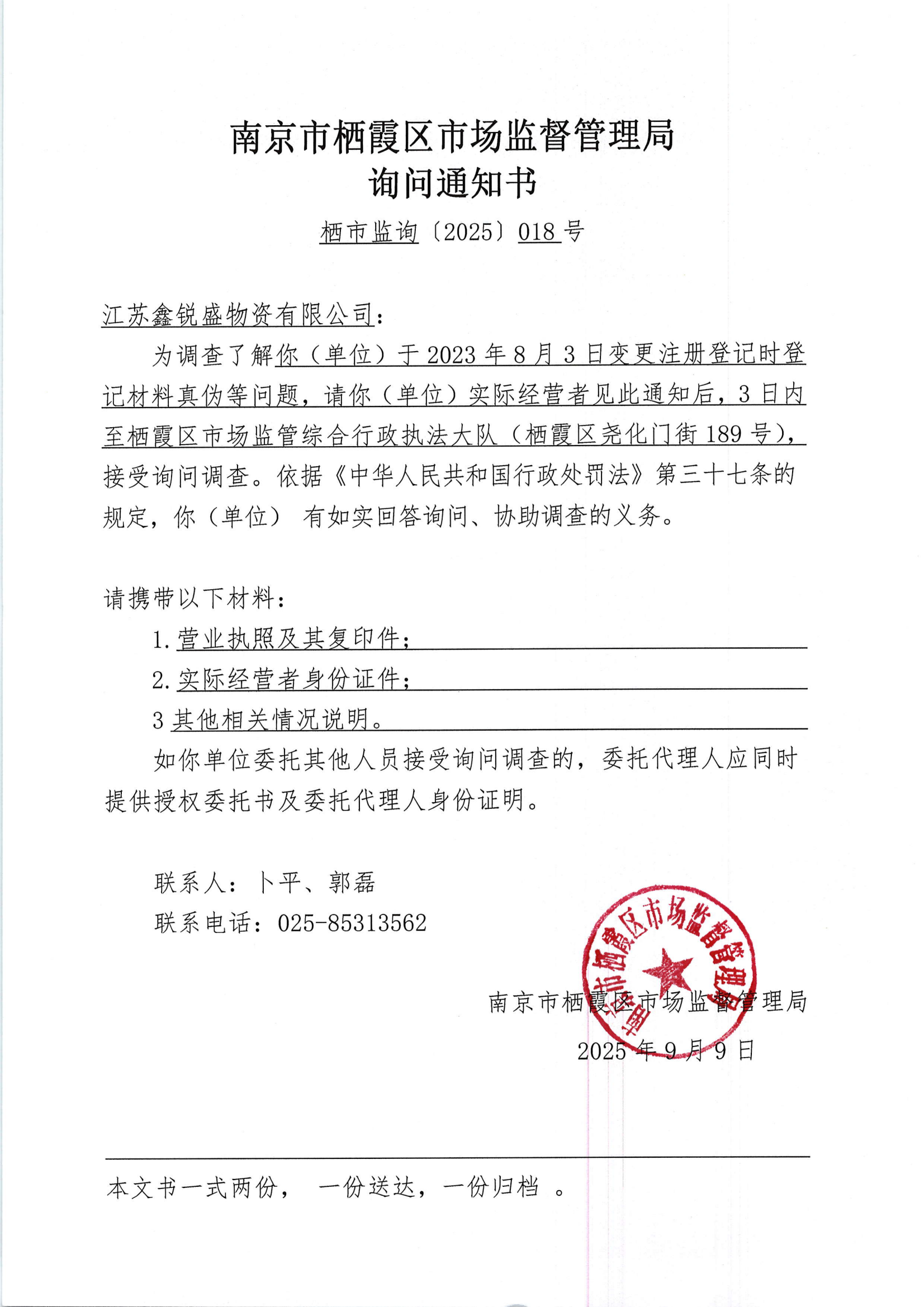 南京市栖霞区市场监督管理局询问通知书(江苏鑫锐盛物资有限公司)