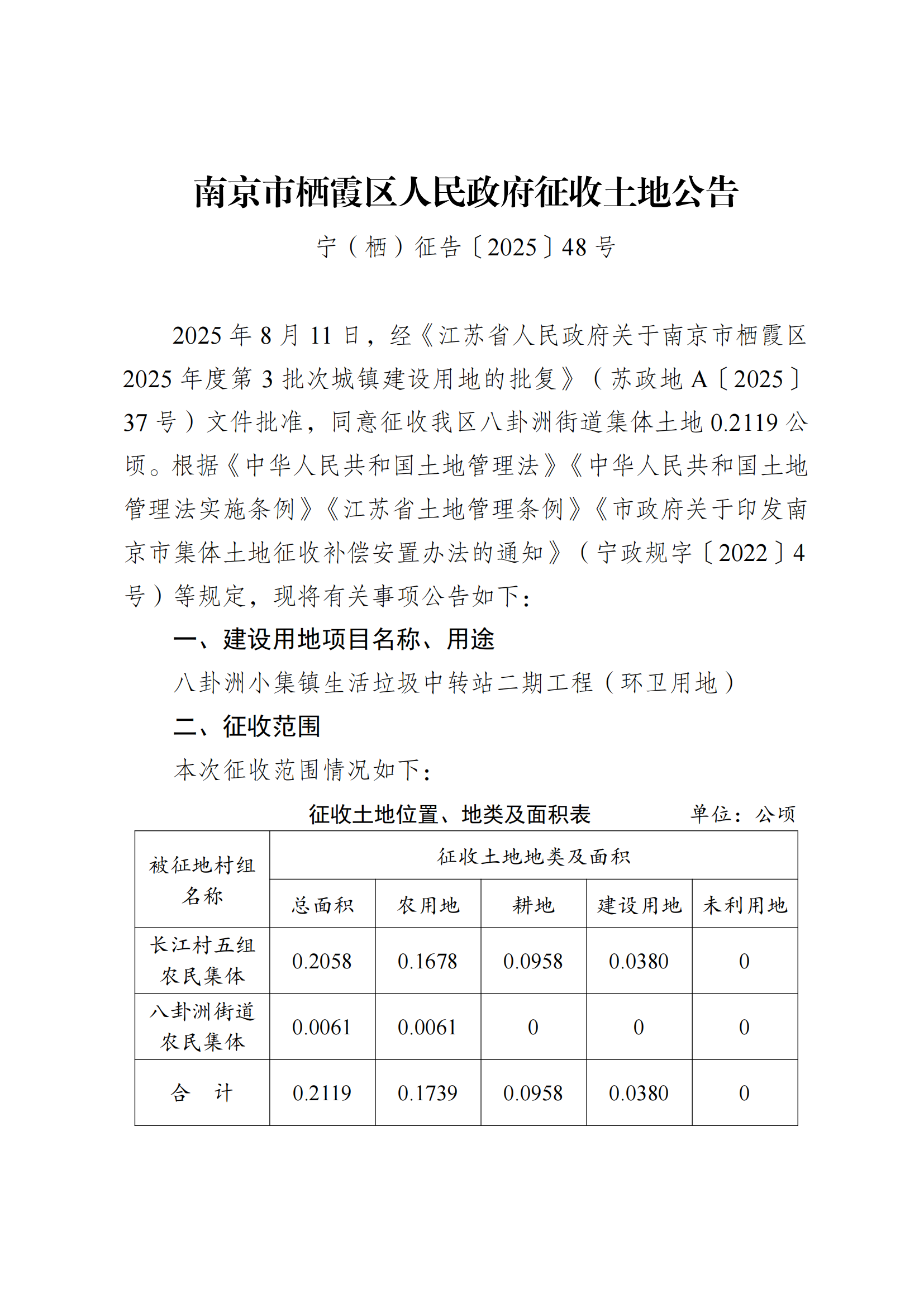 征收土地公告-宁(栖)征告〔2025〕48号-八卦洲小集镇生活垃圾中转站二期工程