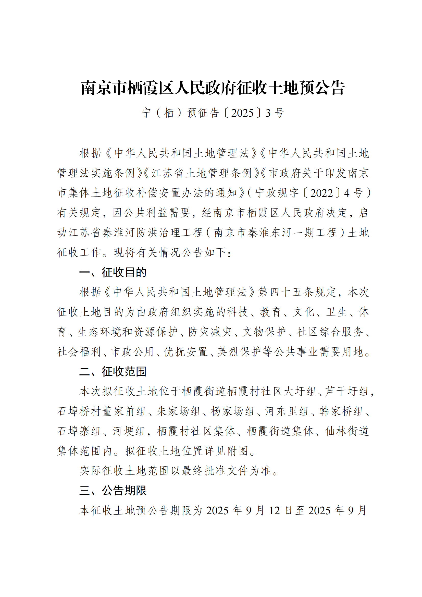 宁(栖)预征告〔2025〕3号-江苏省秦淮河防洪治理工程(南京市秦淮东河一期工程)
