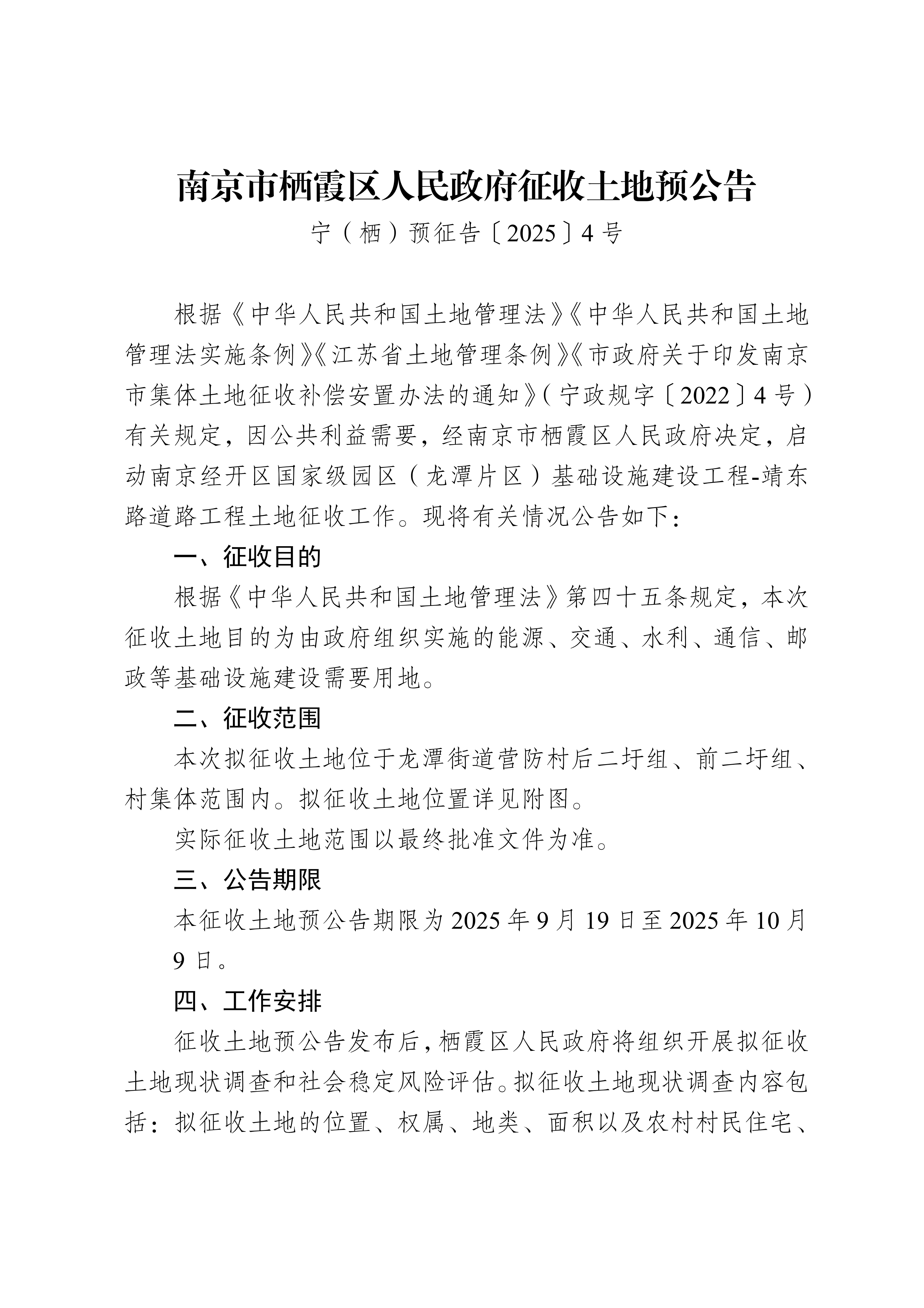 宁(栖)预征告〔2025〕4号-南京经开区国家级园区(龙潭片区)基础设施建设工程-靖东路道路工程