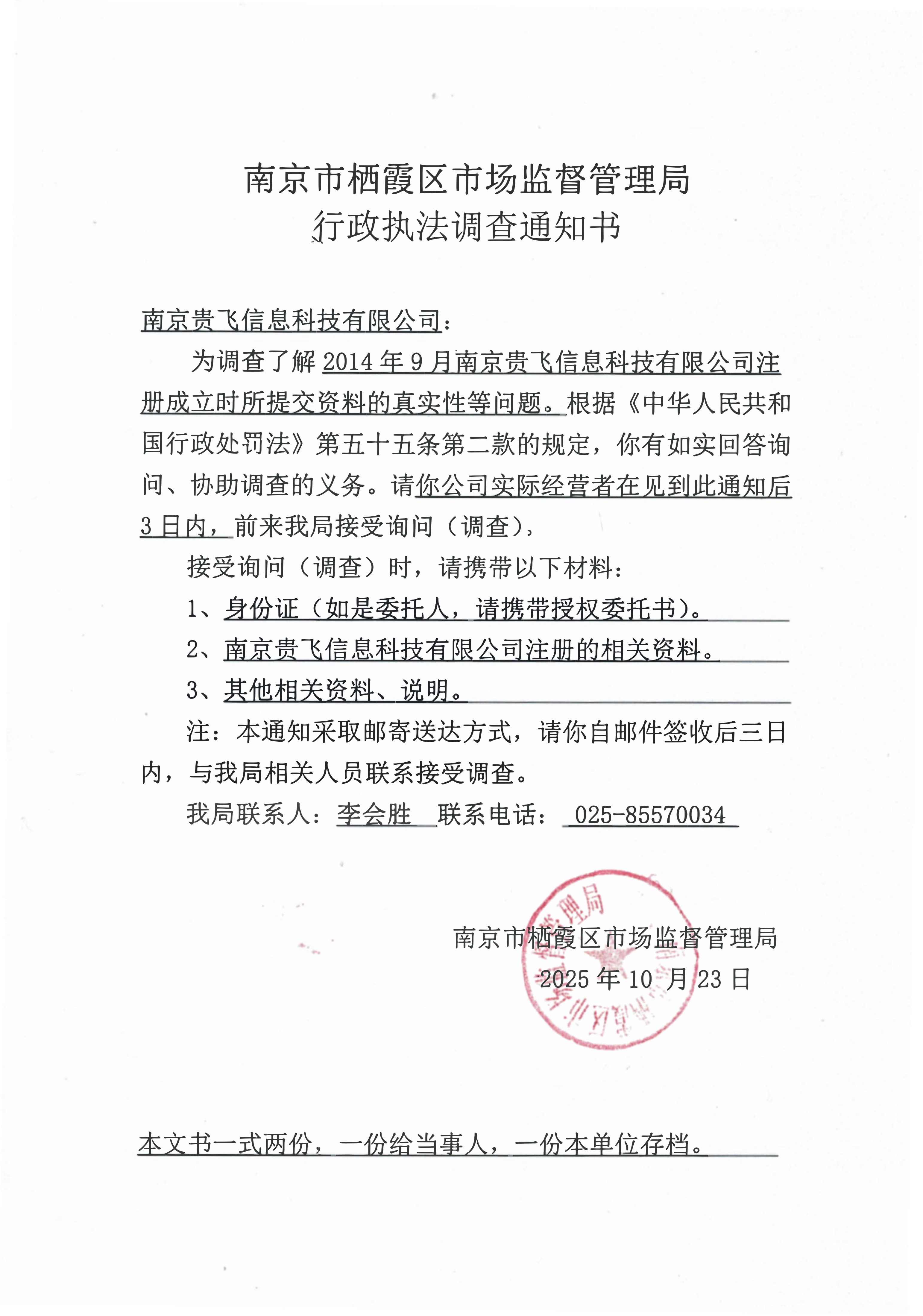 南京市栖霞区市场监督管理局行政执法调查通知书(南京贵飞信息科技有限公司)