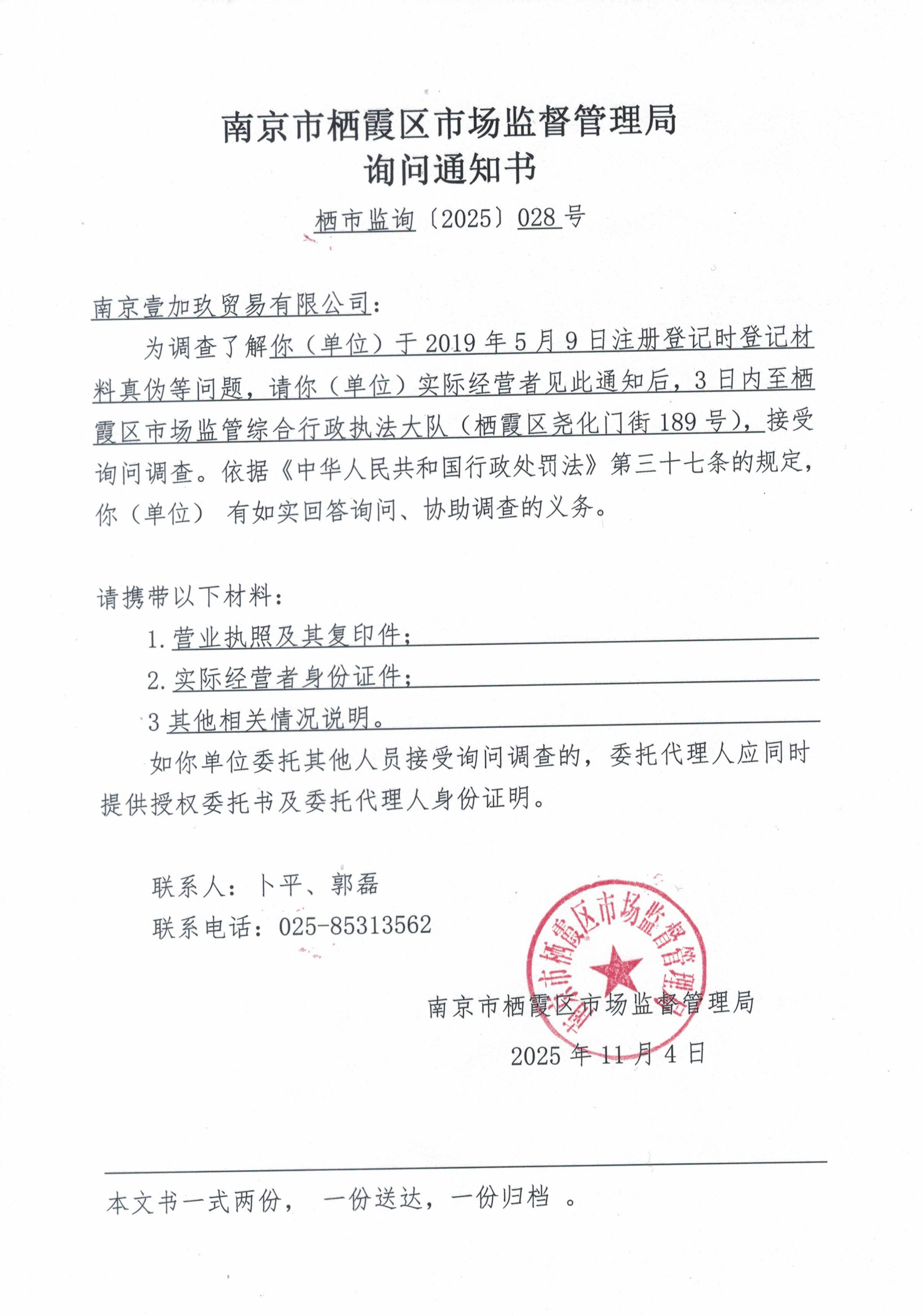 南京市栖霞区市场监督管理局询问通知书(南京壹加玖贸易有限公司)