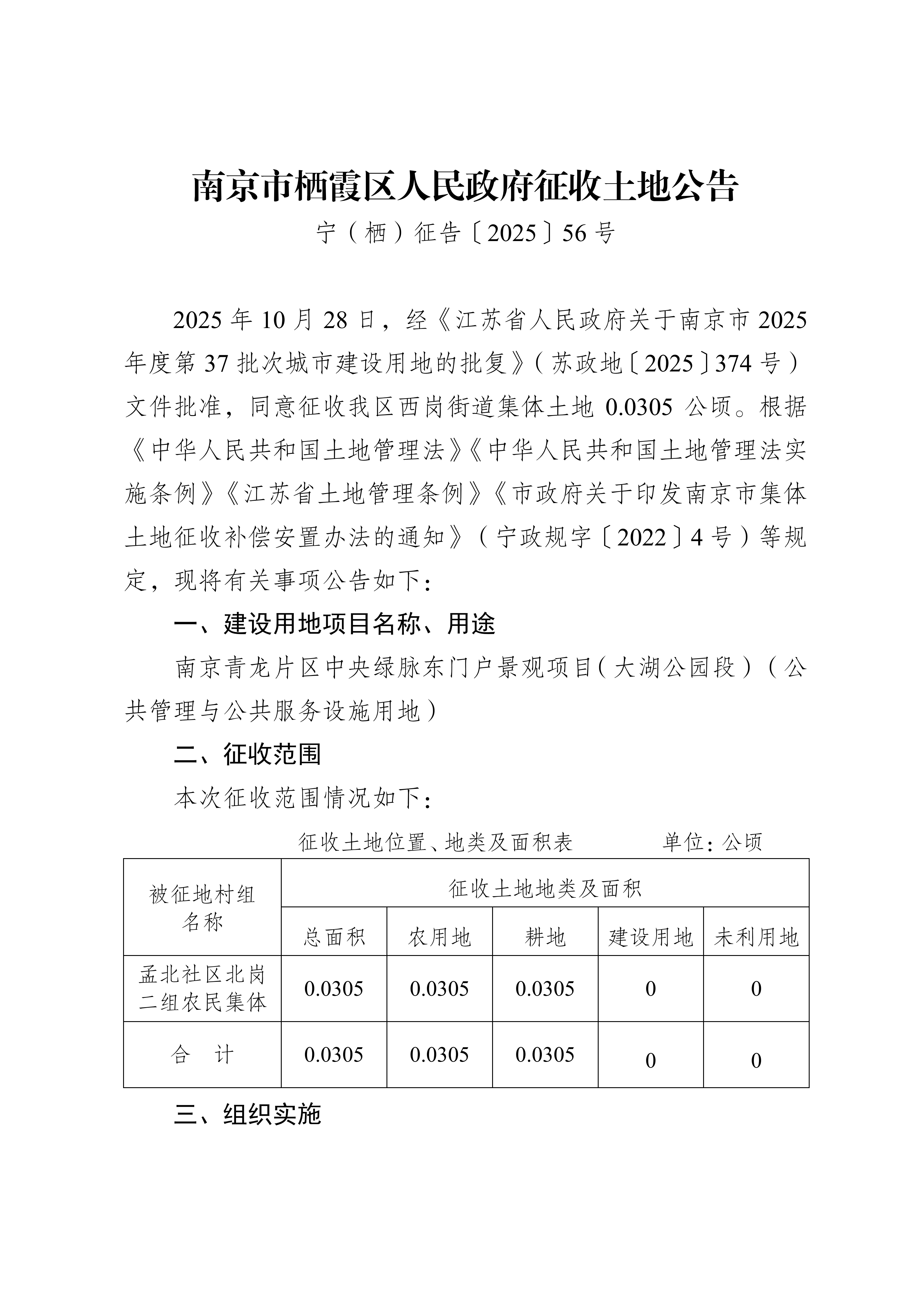 征收土地公告-宁(栖)征告〔2025〕56号-南京青龙片区中央绿脉东门户景观项目(大湖公园段)