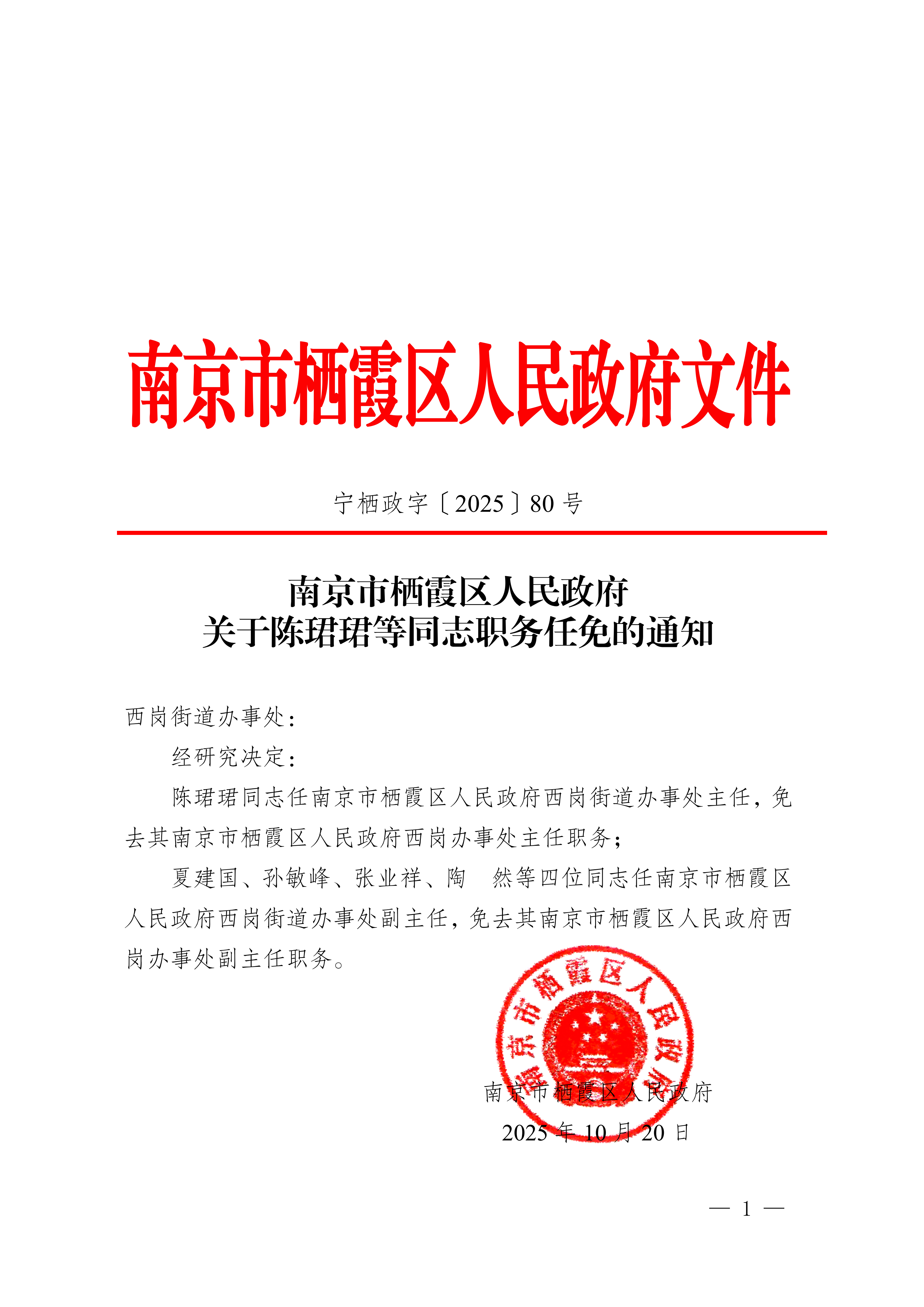 宁栖政字〔2025〕80号 南京市栖霞区人民政府关于陈珺珺等同志职务任免的通知