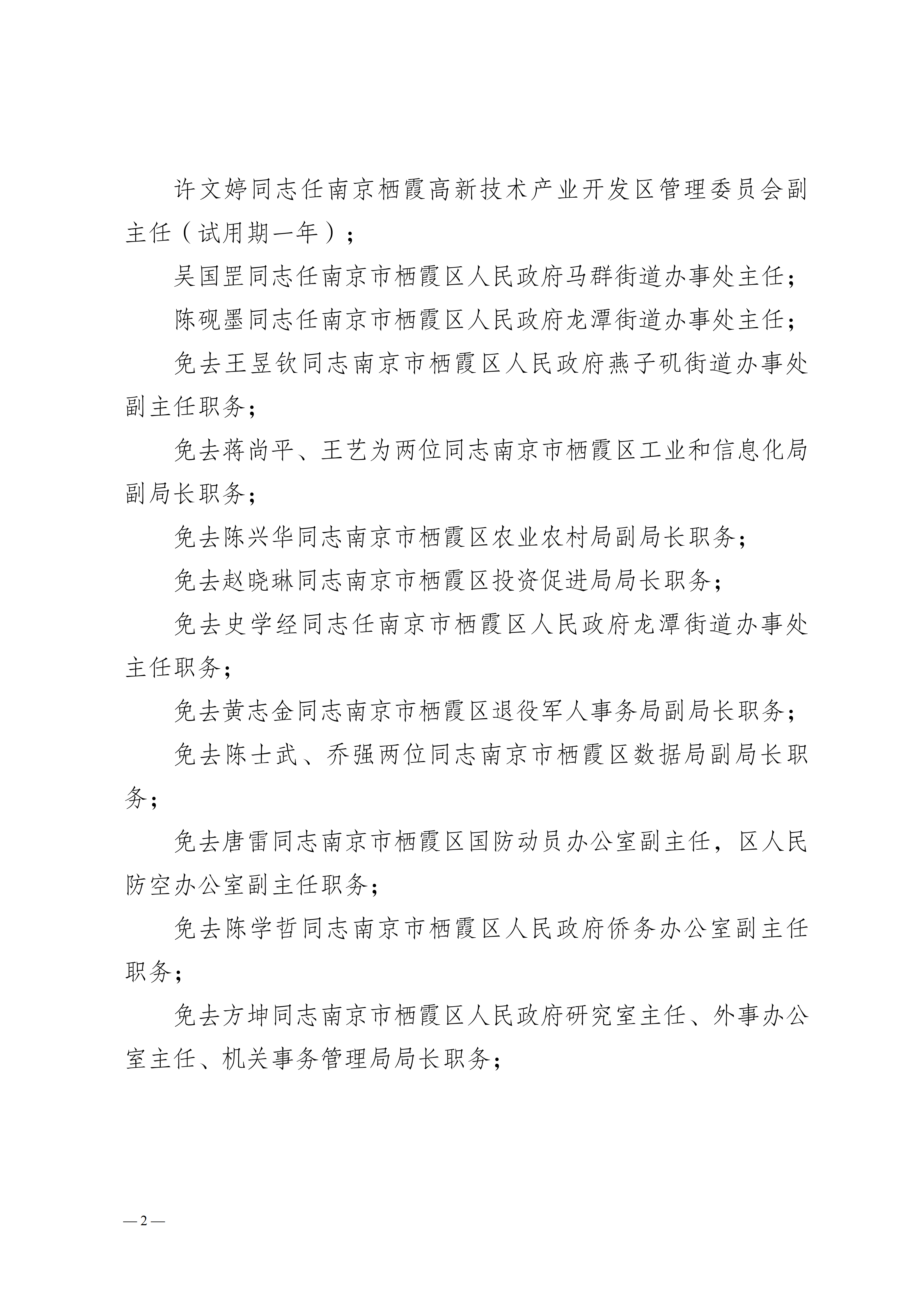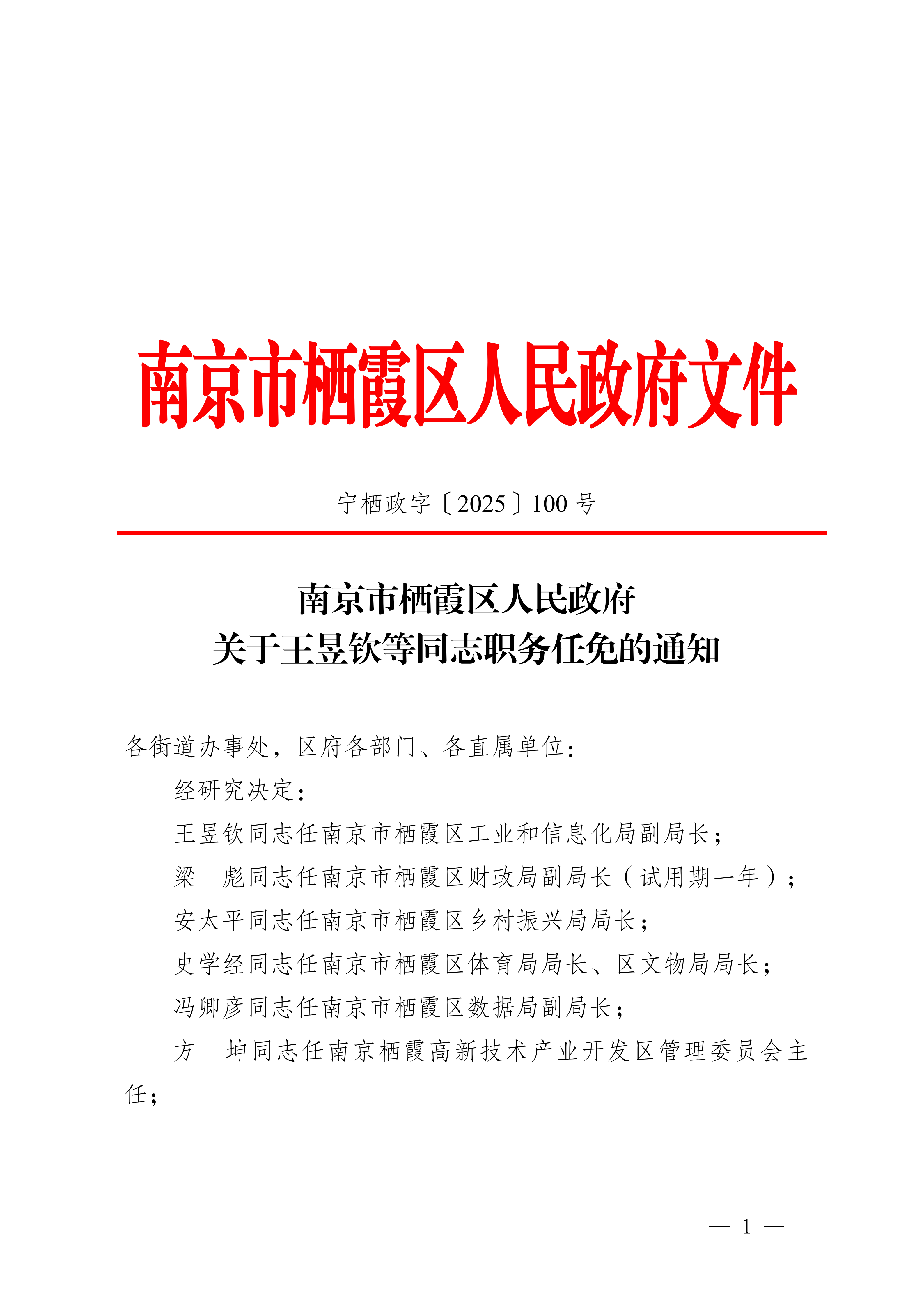 宁栖政字〔2025〕100号 南京市栖霞区人民政府关于王昱钦等同志任免的通知