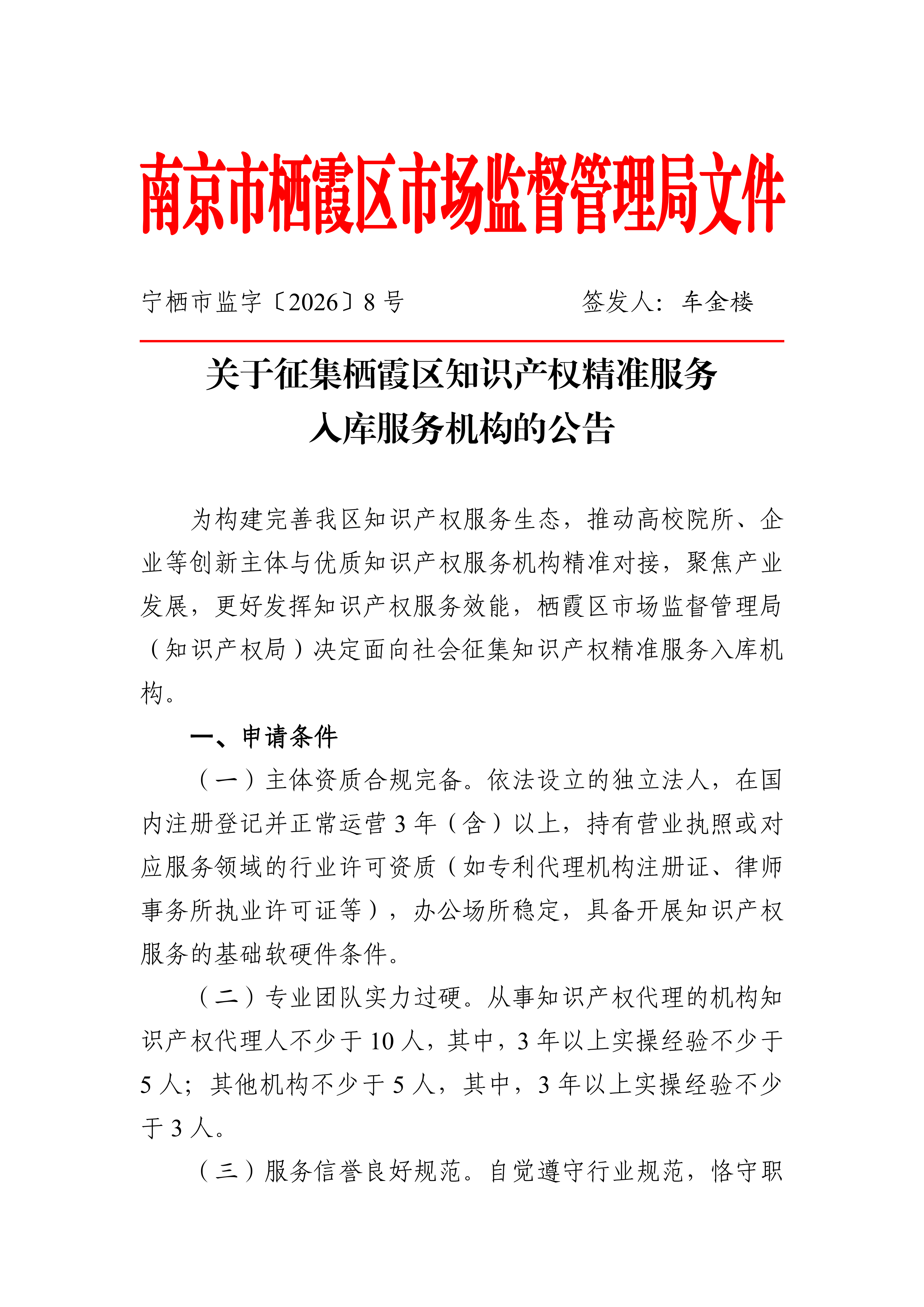 关于征集栖霞区知识产权精准服务入库服务机构的公告