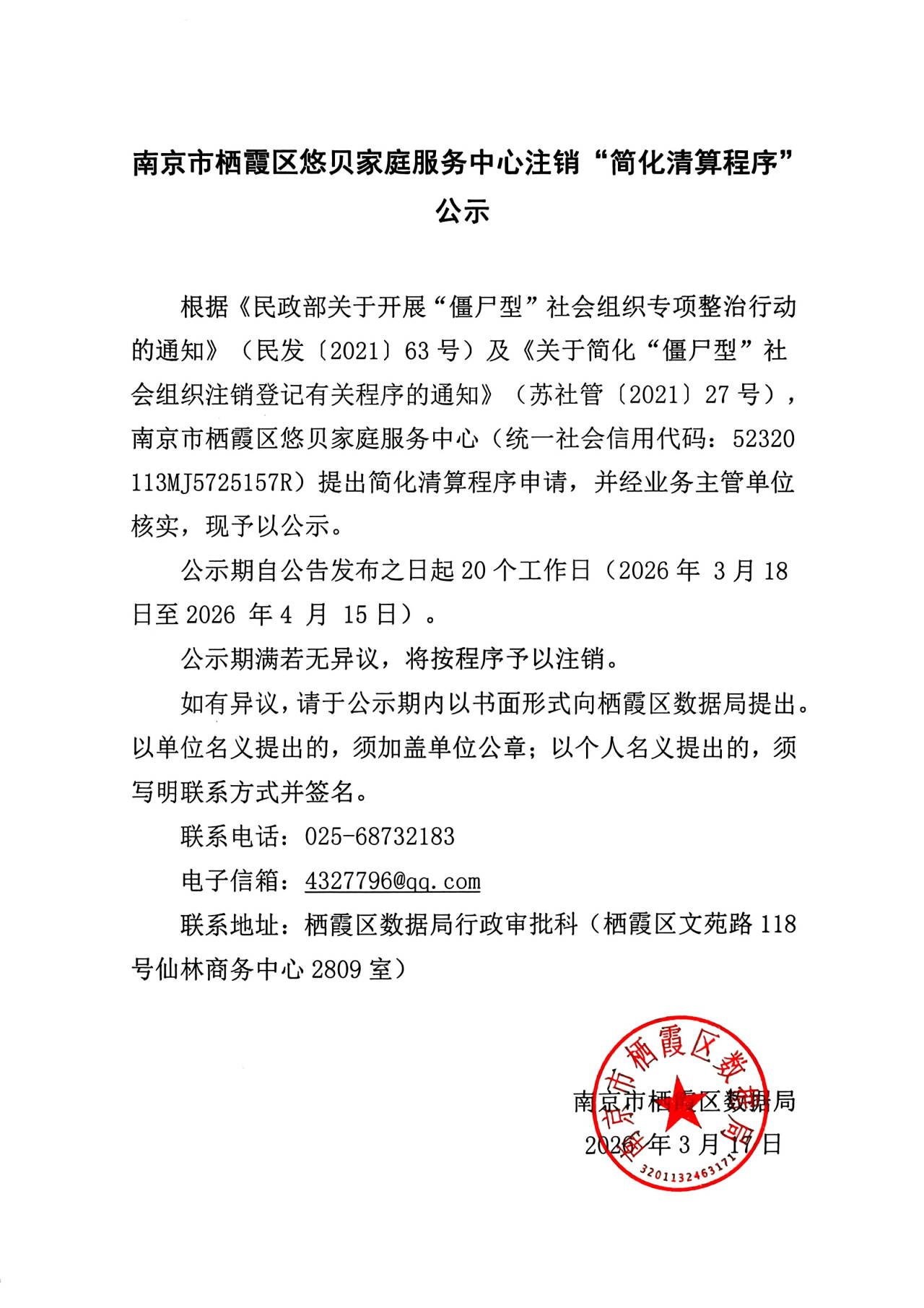 南京市栖霞区悠贝家庭服务中心注销“简化清算程序”公示