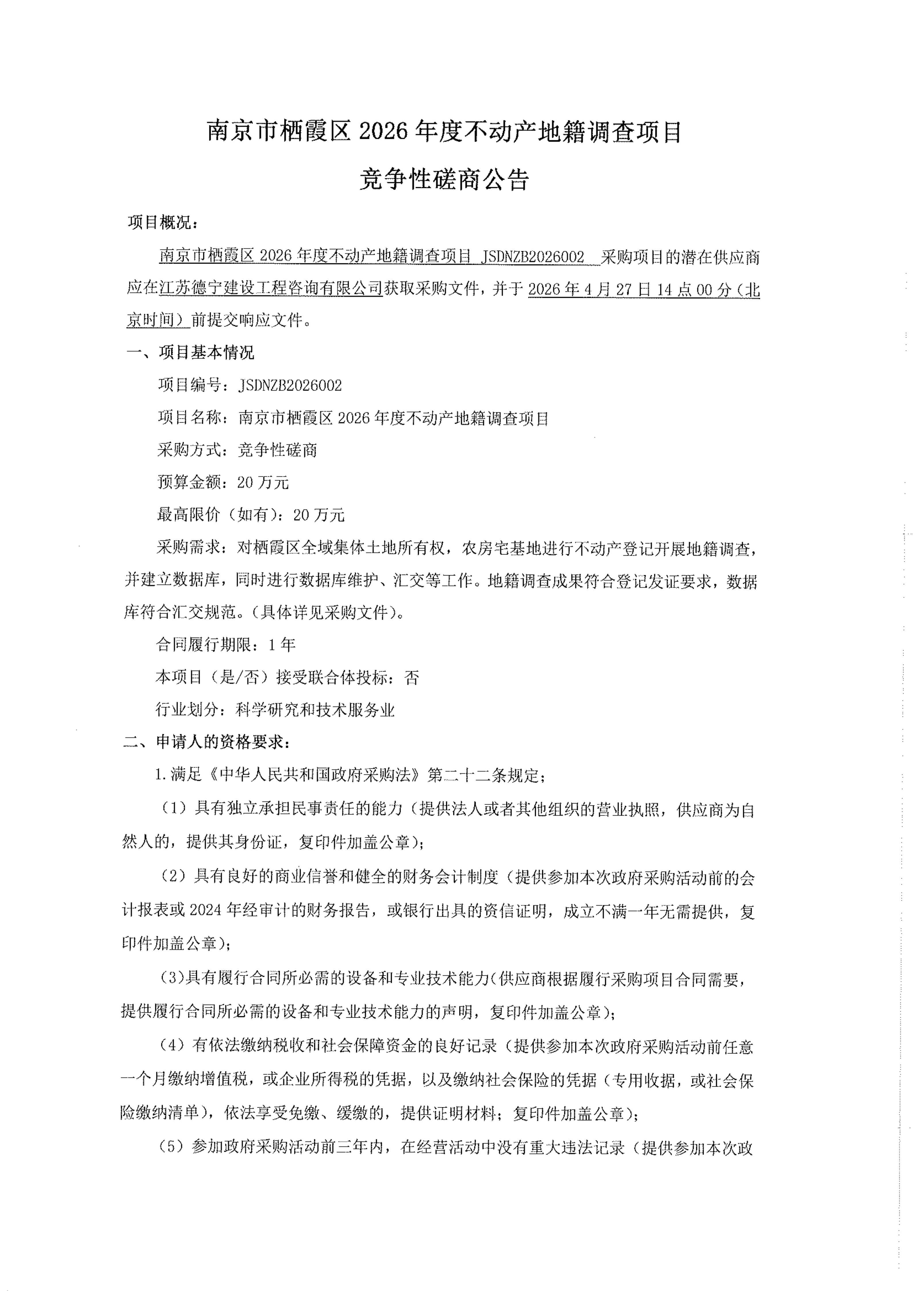南京市栖霞区2026年度不动产地籍调查项目竞争性磋商公告