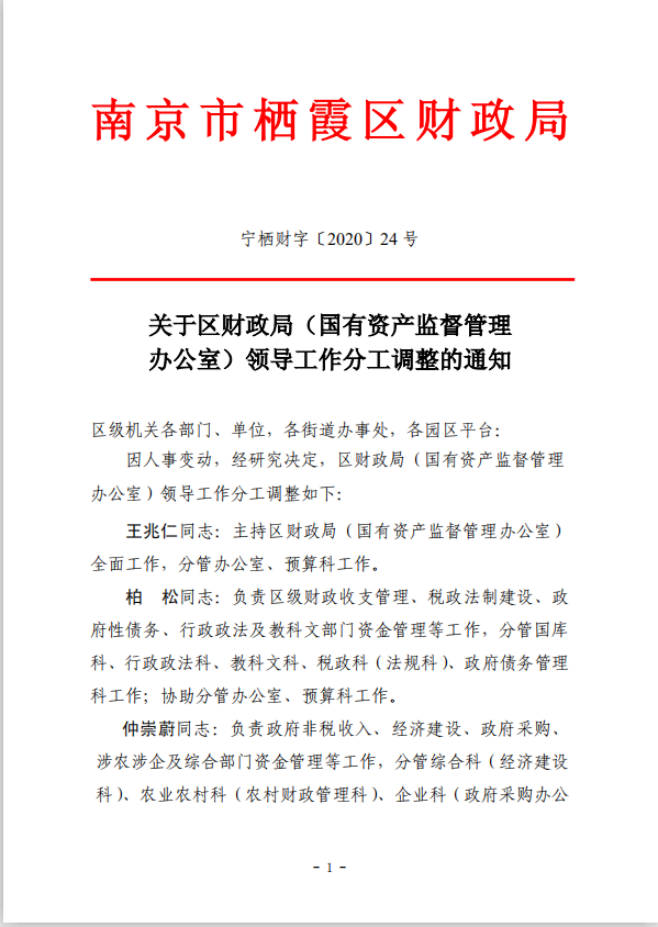 关于区财政局(国有资产监督管理办公室)领导工作分工调整的通知