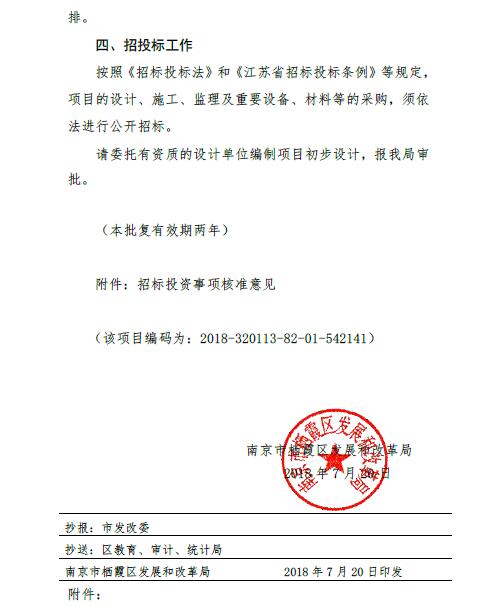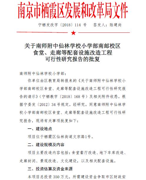 内容概览: | 宁栖发改字〔2018〕114号 关于南师附中仙林学校小学部南邮校区食堂、走廊等配套设施改造工程可行性研究报告的批复 | ||
