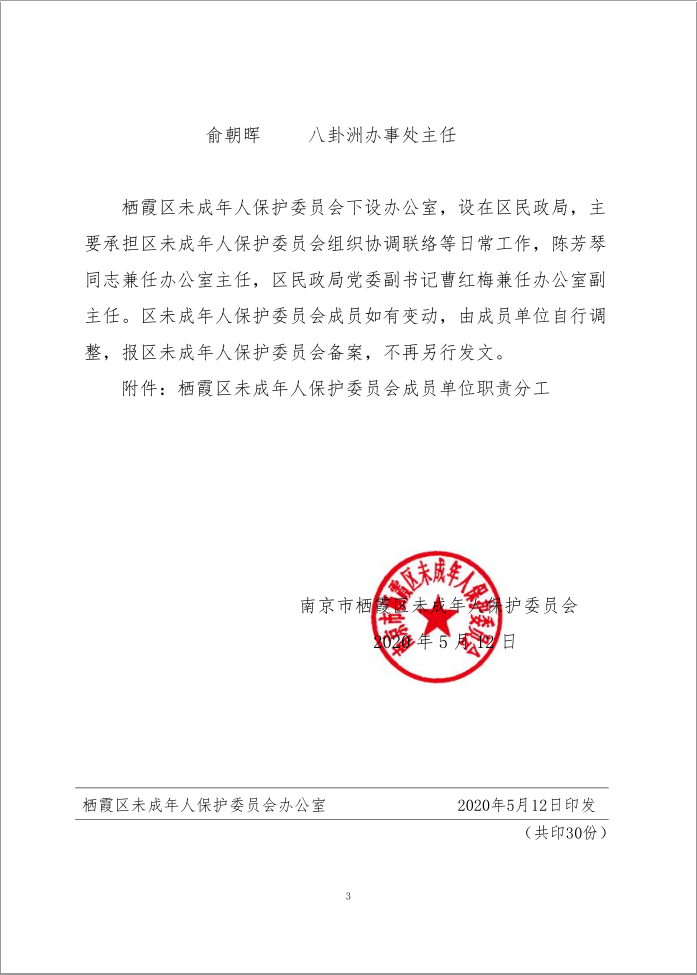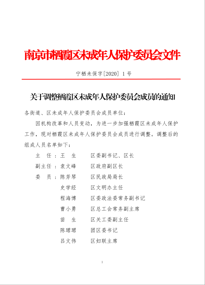 关于调整栖霞区未成年人保护委员会的通知
