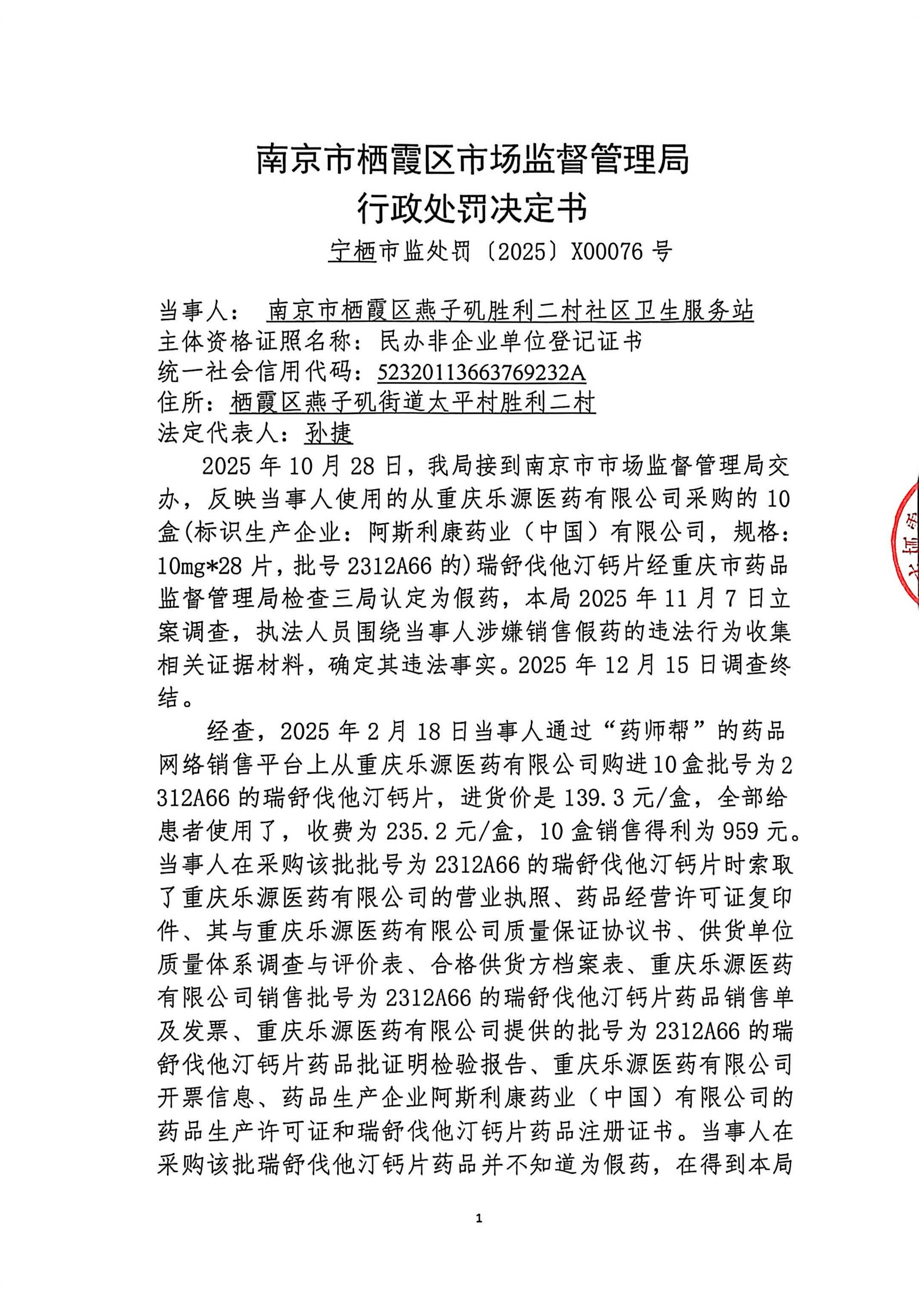 南京市栖霞区市场监督管理局行政处罚决定书(宁栖市监处罚【2025】X00076号)
