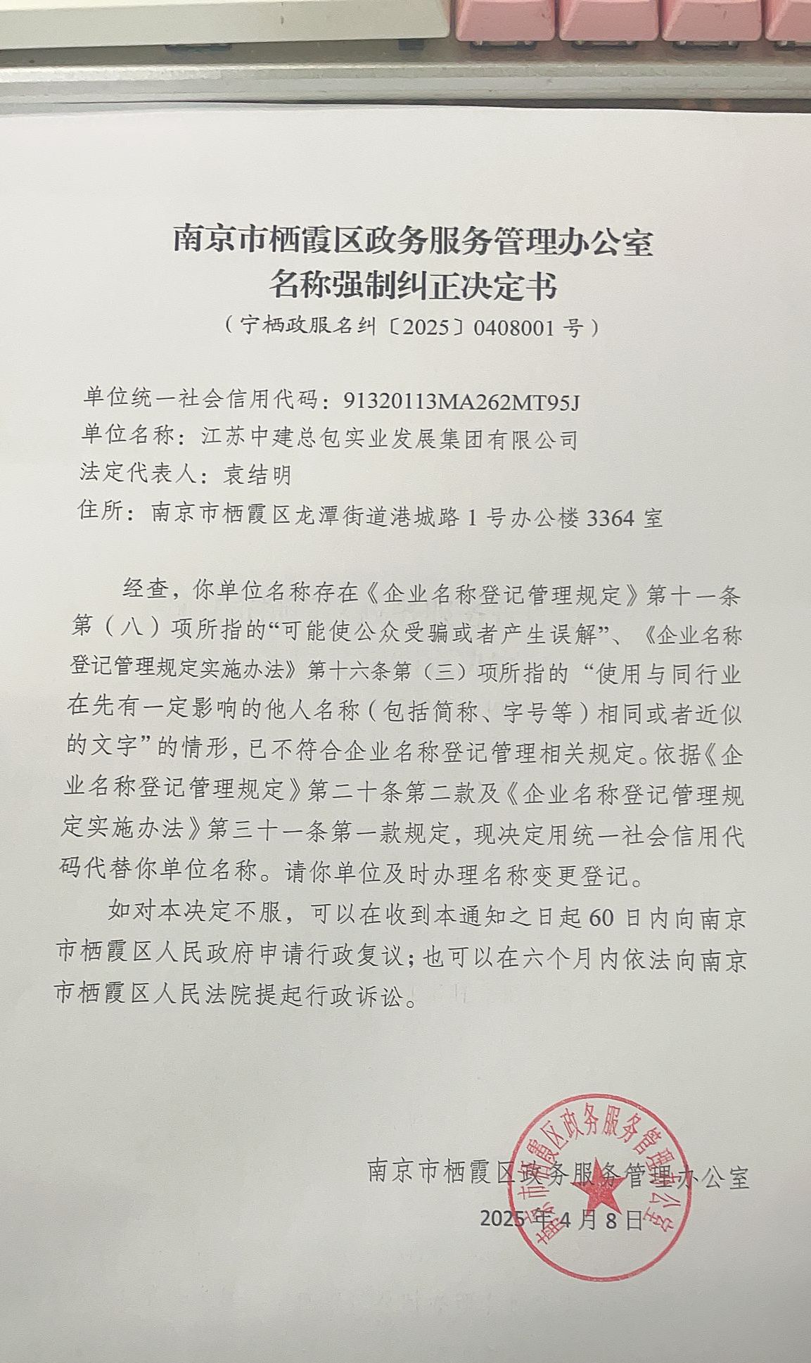 南京市栖霞区政务服务管理办公室名称强制纠正决定书