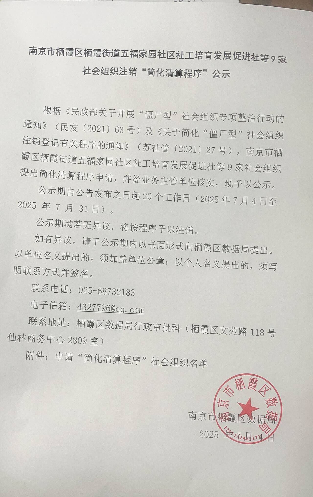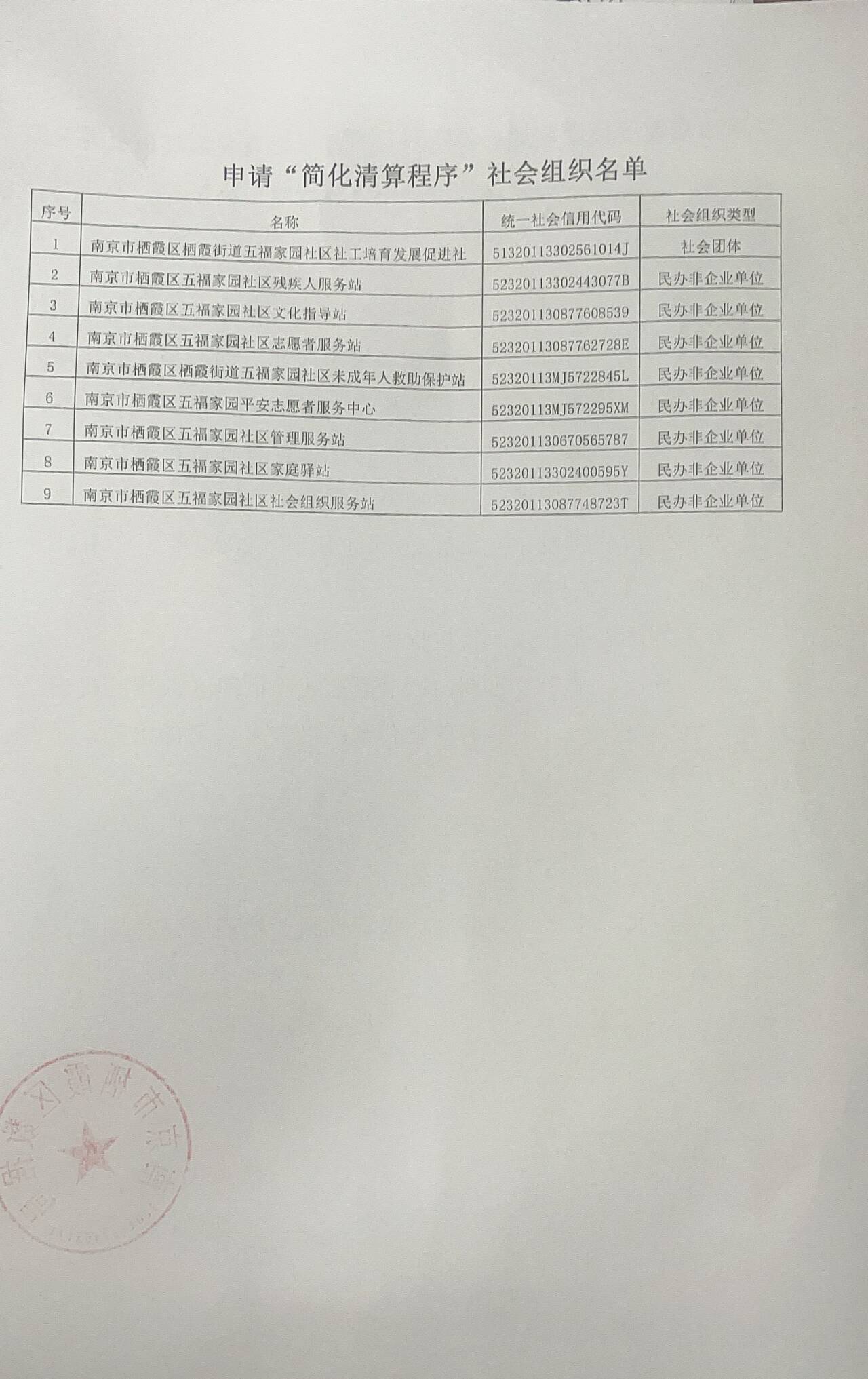 南京市栖霞区栖霞街道五福家园社区社工培育发展促进社等9家社会组织注销“简化清算程序”公示
