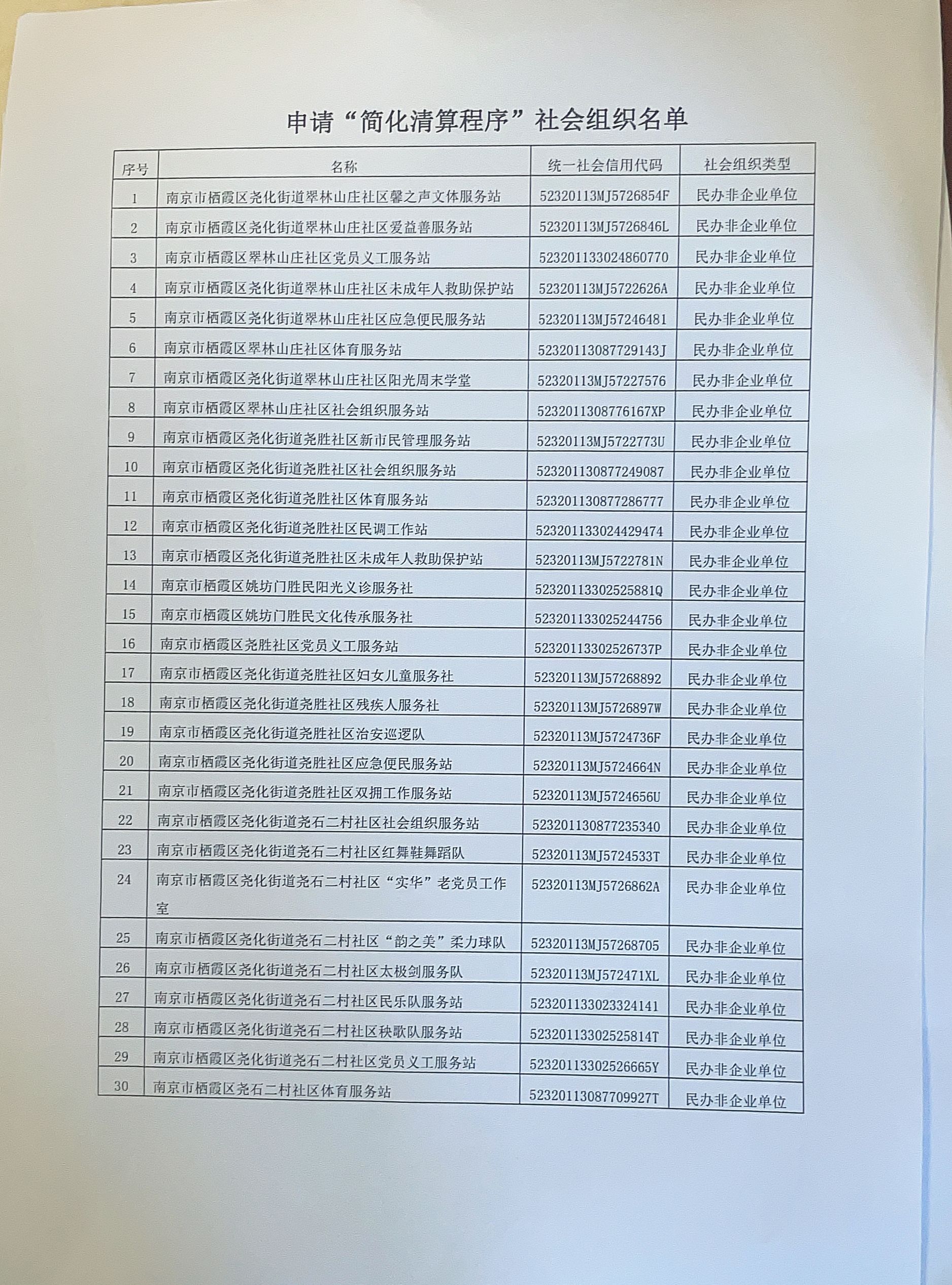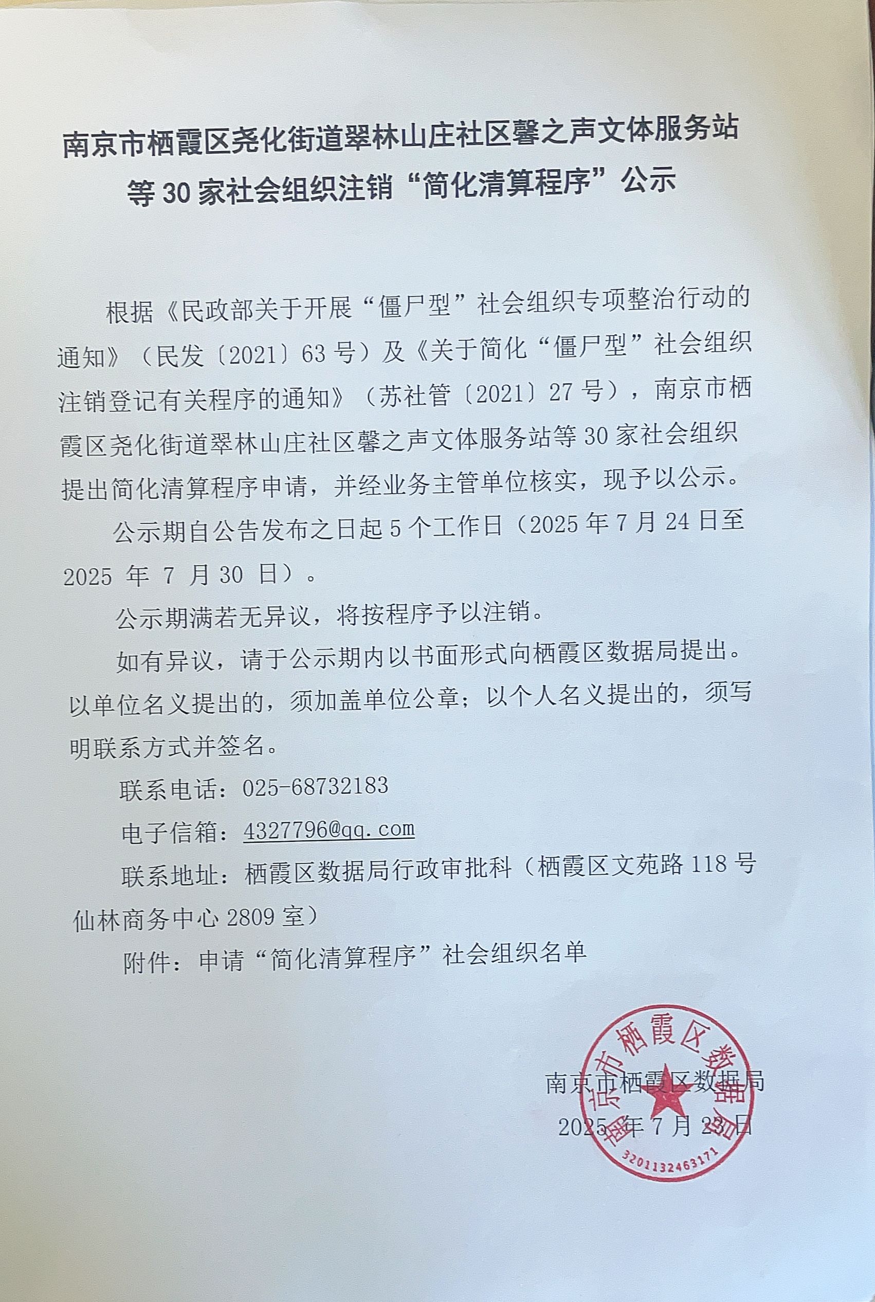 南京市栖霞区尧化街道翠林山庄社区馨之声文体服务站等30家社会组织注销“简化清算程序”公示