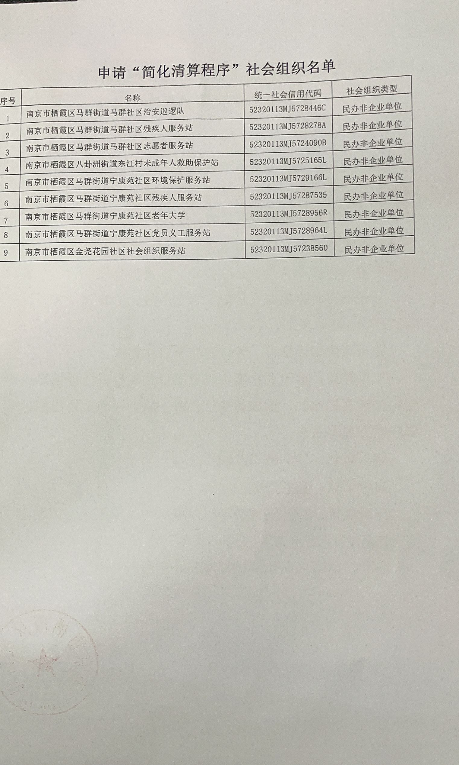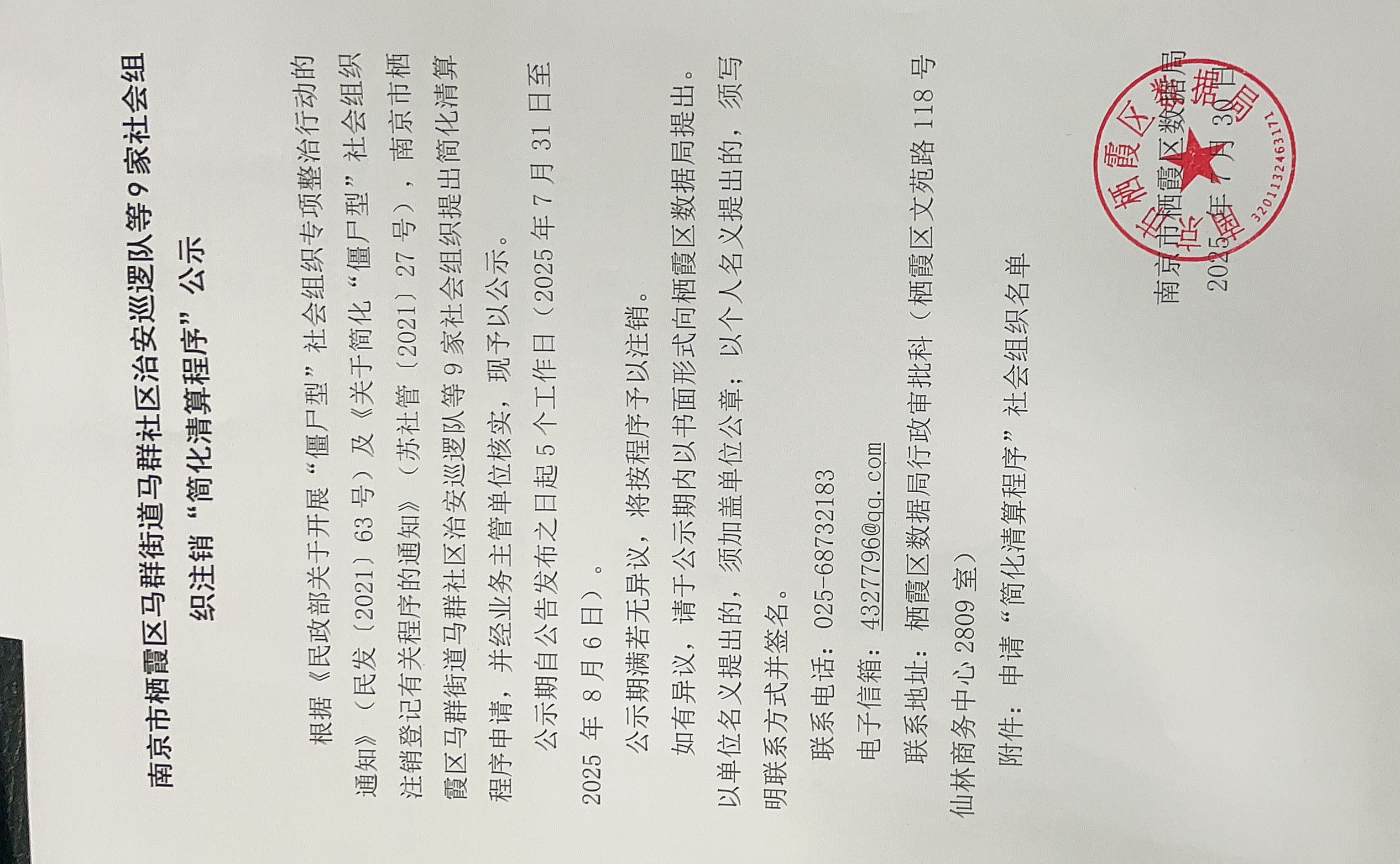 南京市栖霞区马群街道马群社区治安巡逻队等9家社会组织注销“简化清算程序”公示