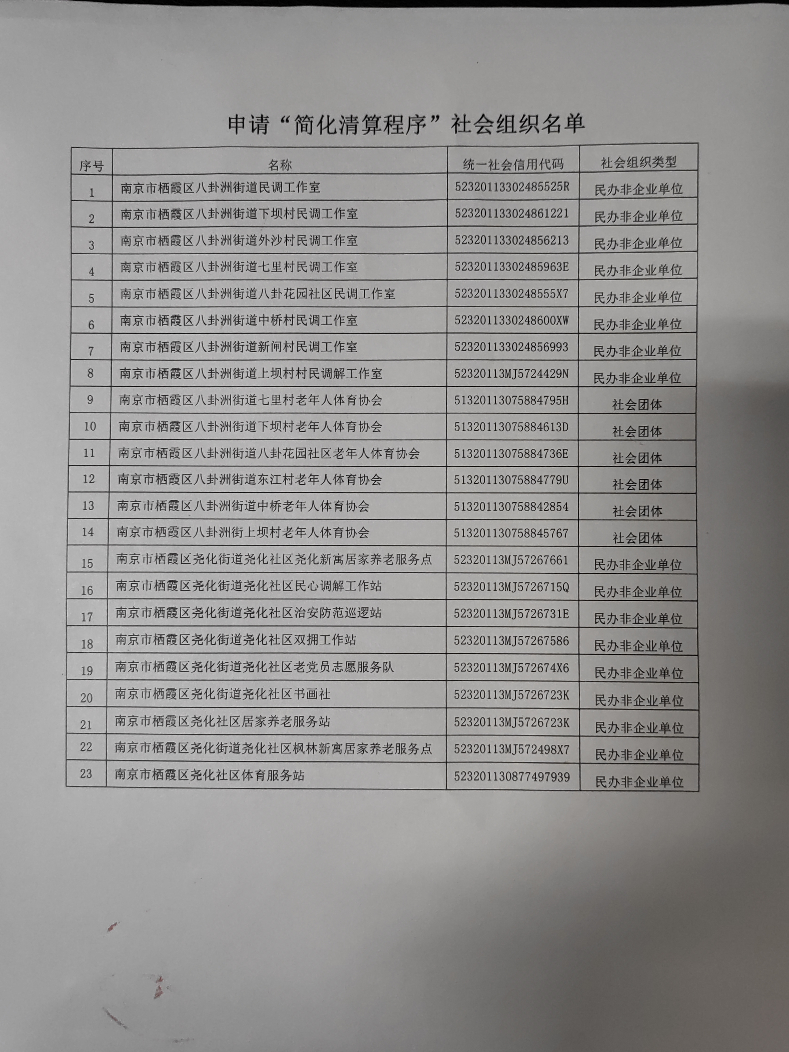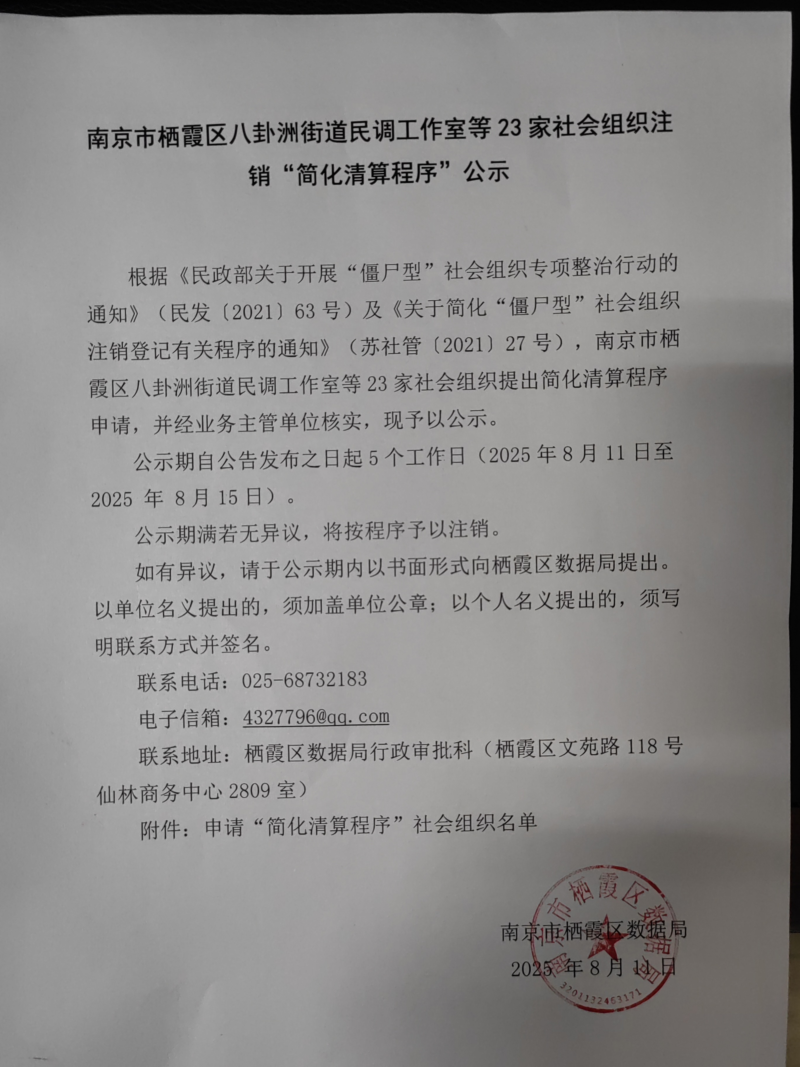 南京市栖霞区八卦洲街道民调工作室等23家社会组织注销“简化清算程序”公示
