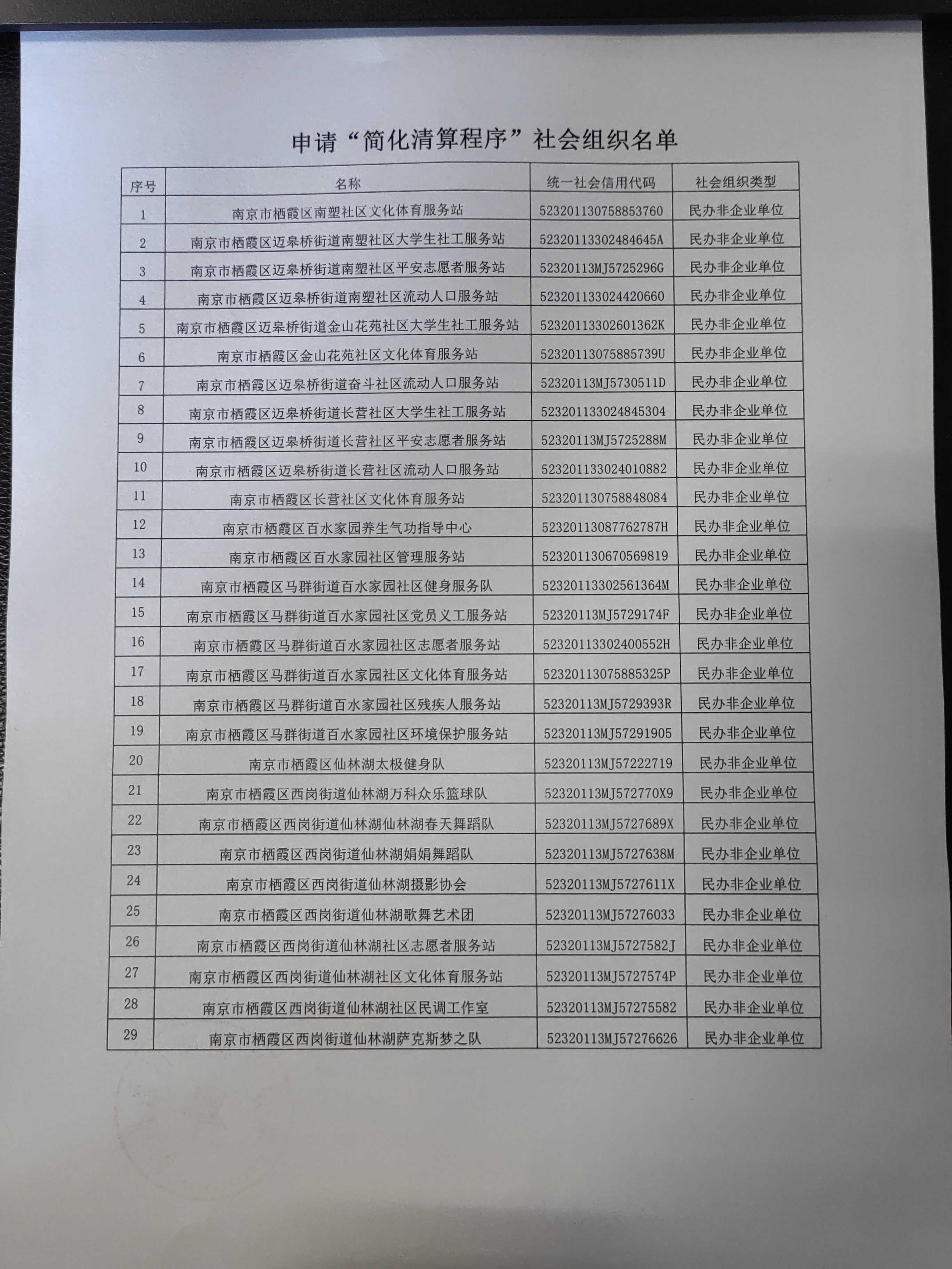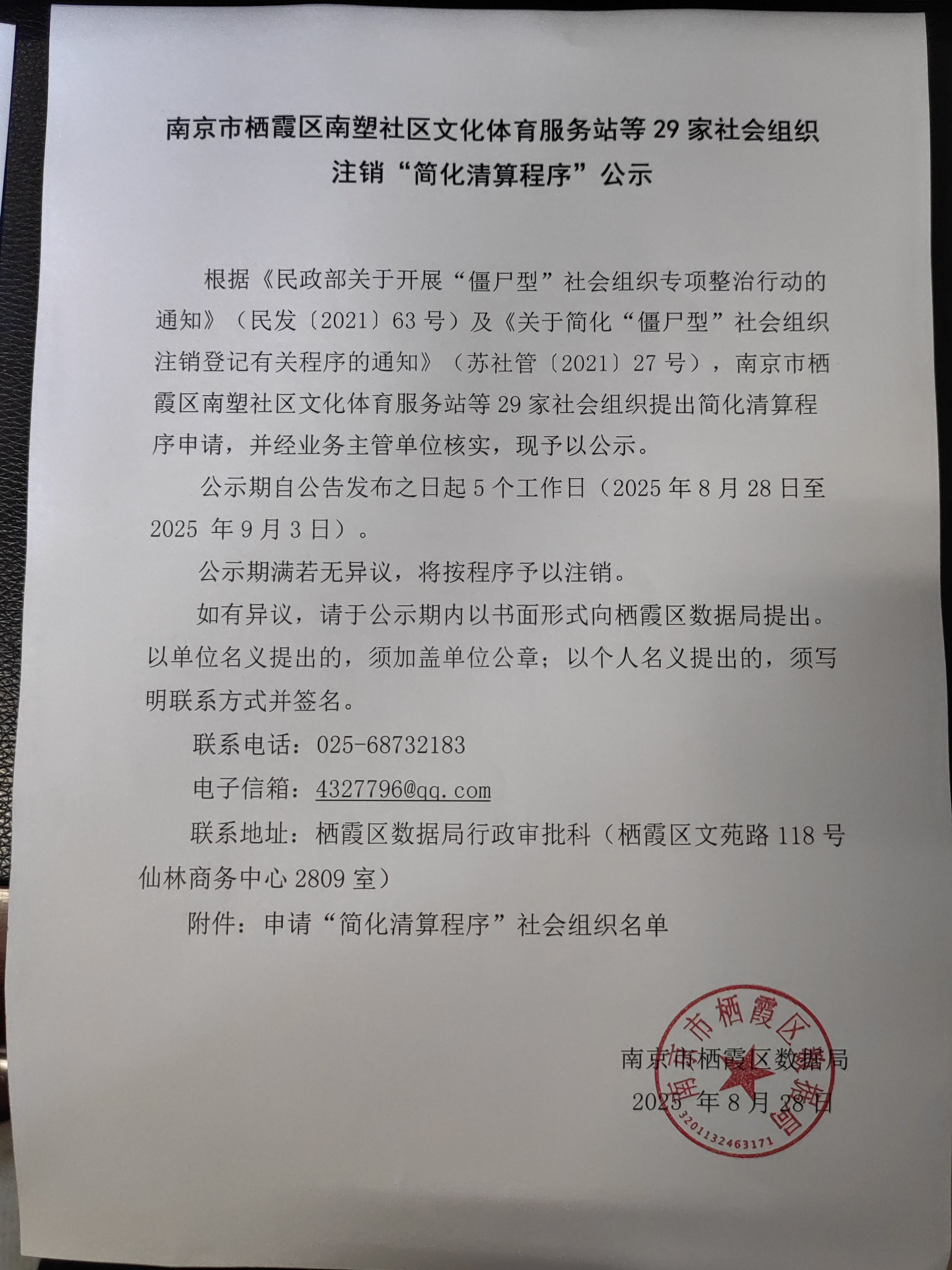 南京市栖霞区南塑社区文化体育服务站等29家社会组织注销“简化清算程序”公示