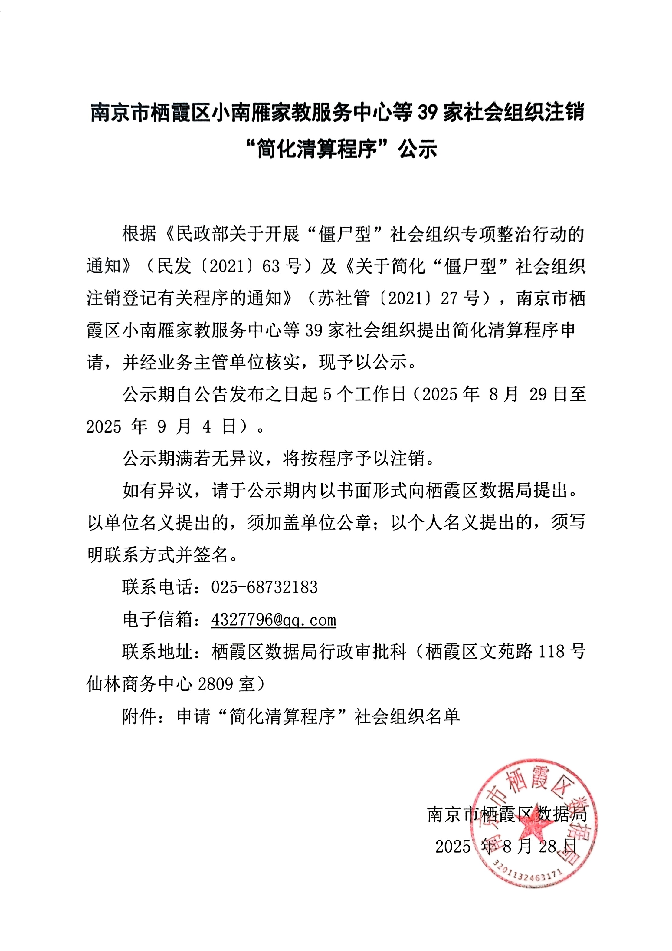 南京市栖霞区小南雁家教服务中心等39家社会组织注销 “简化清算程序”公示