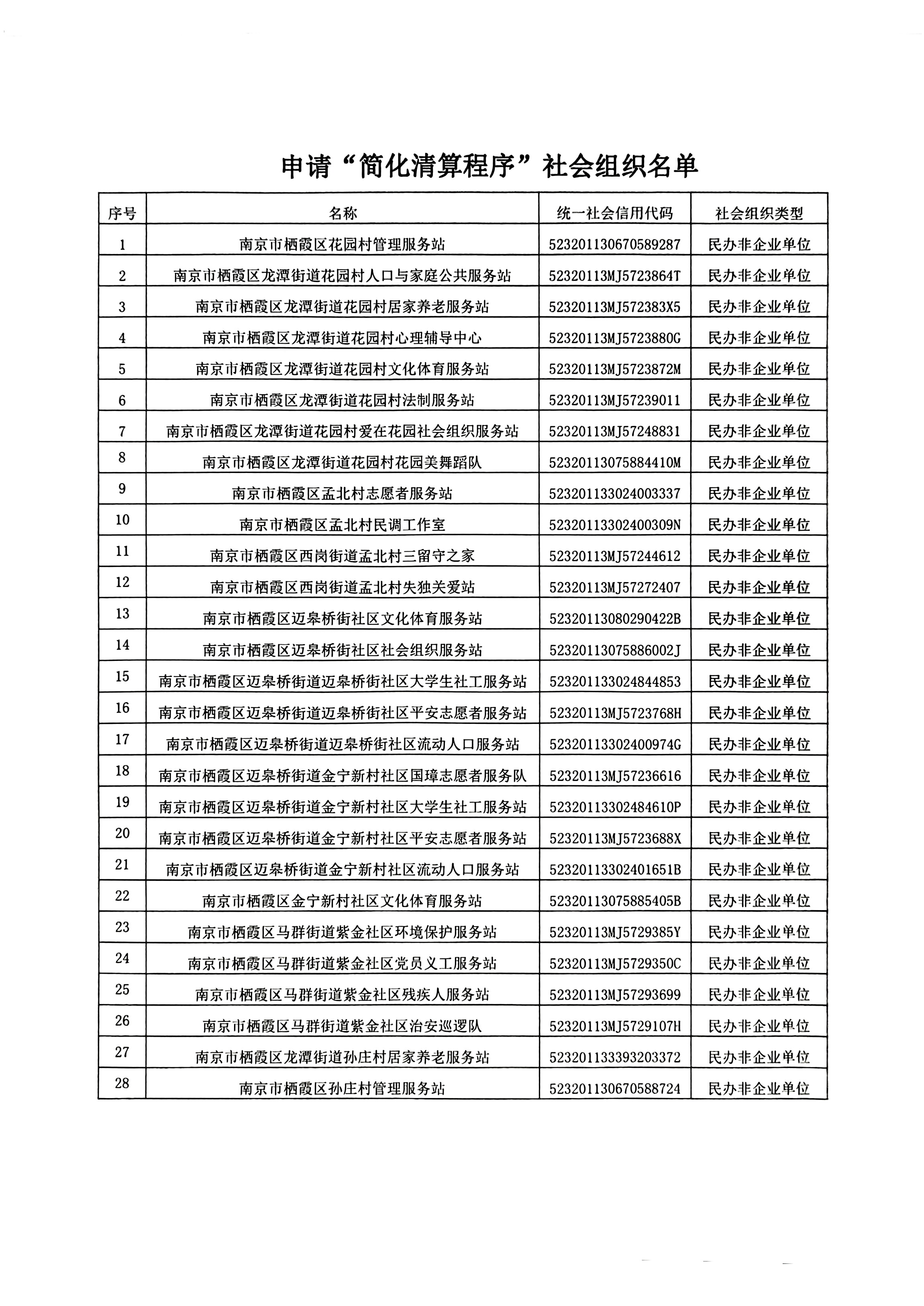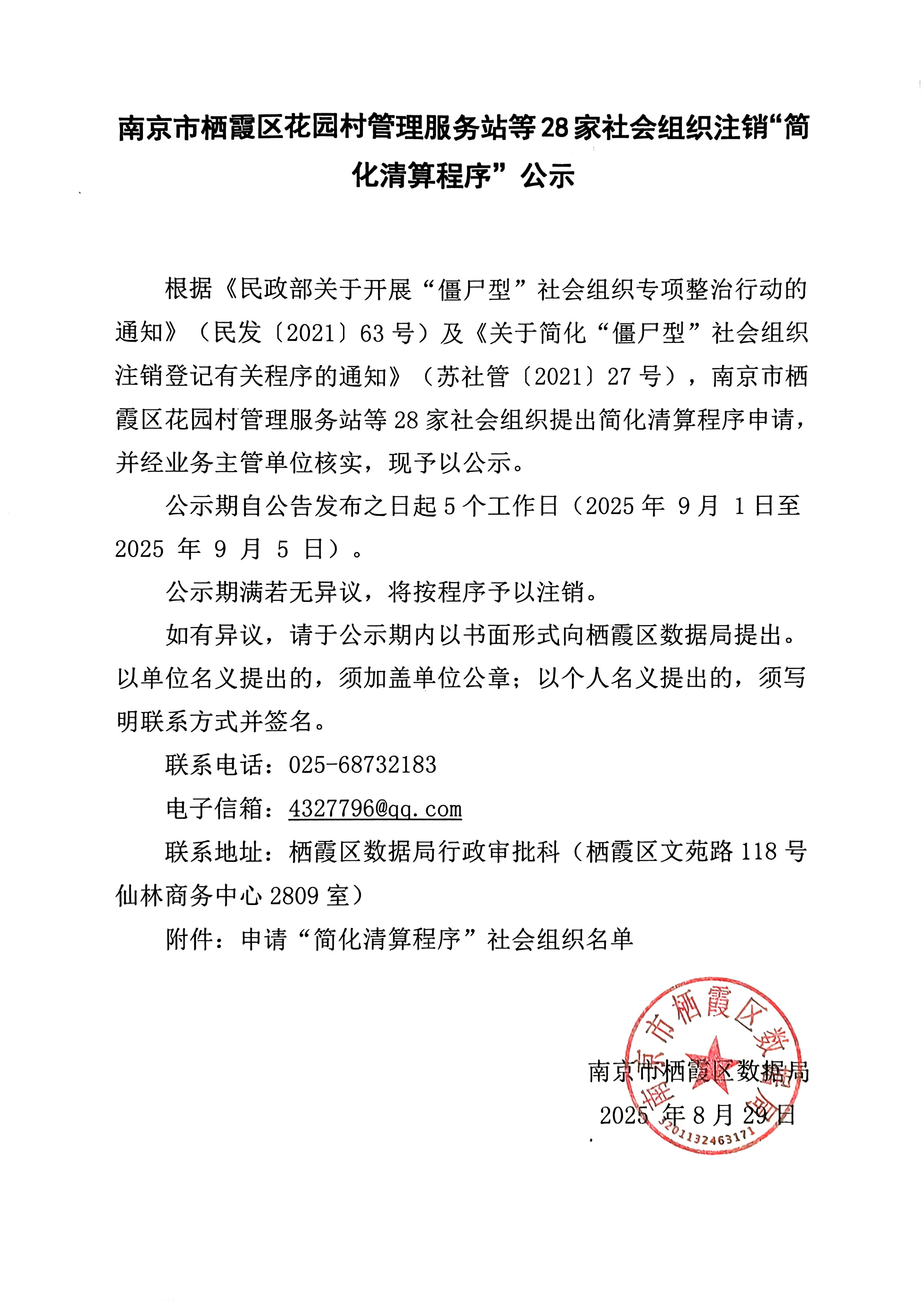 南京市栖霞区花园村管理服务站等28家社会组织注销“简化清算程序”公示