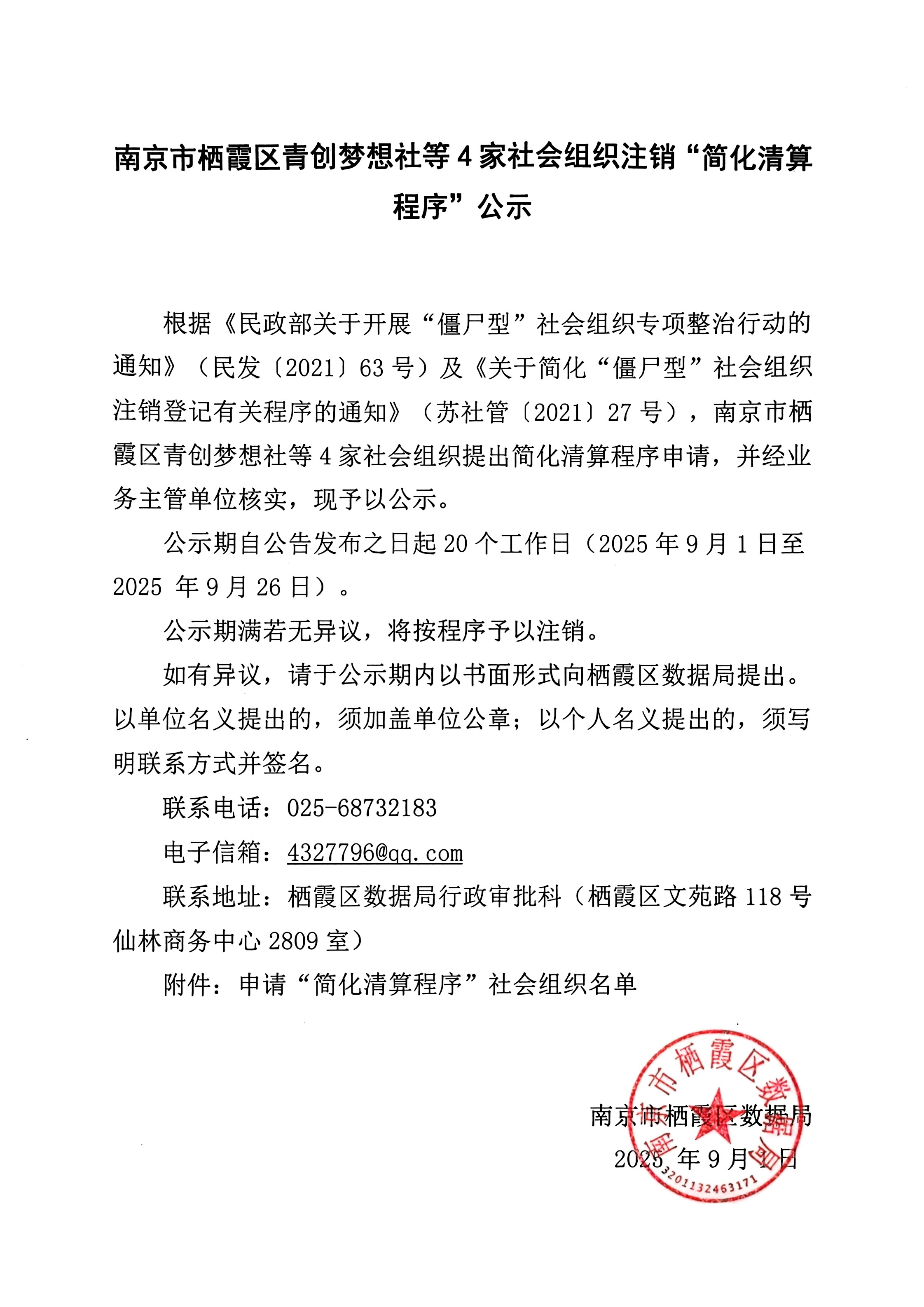 南京市栖霞区青创梦想社等4家社会组织注销“简化清算程序公示