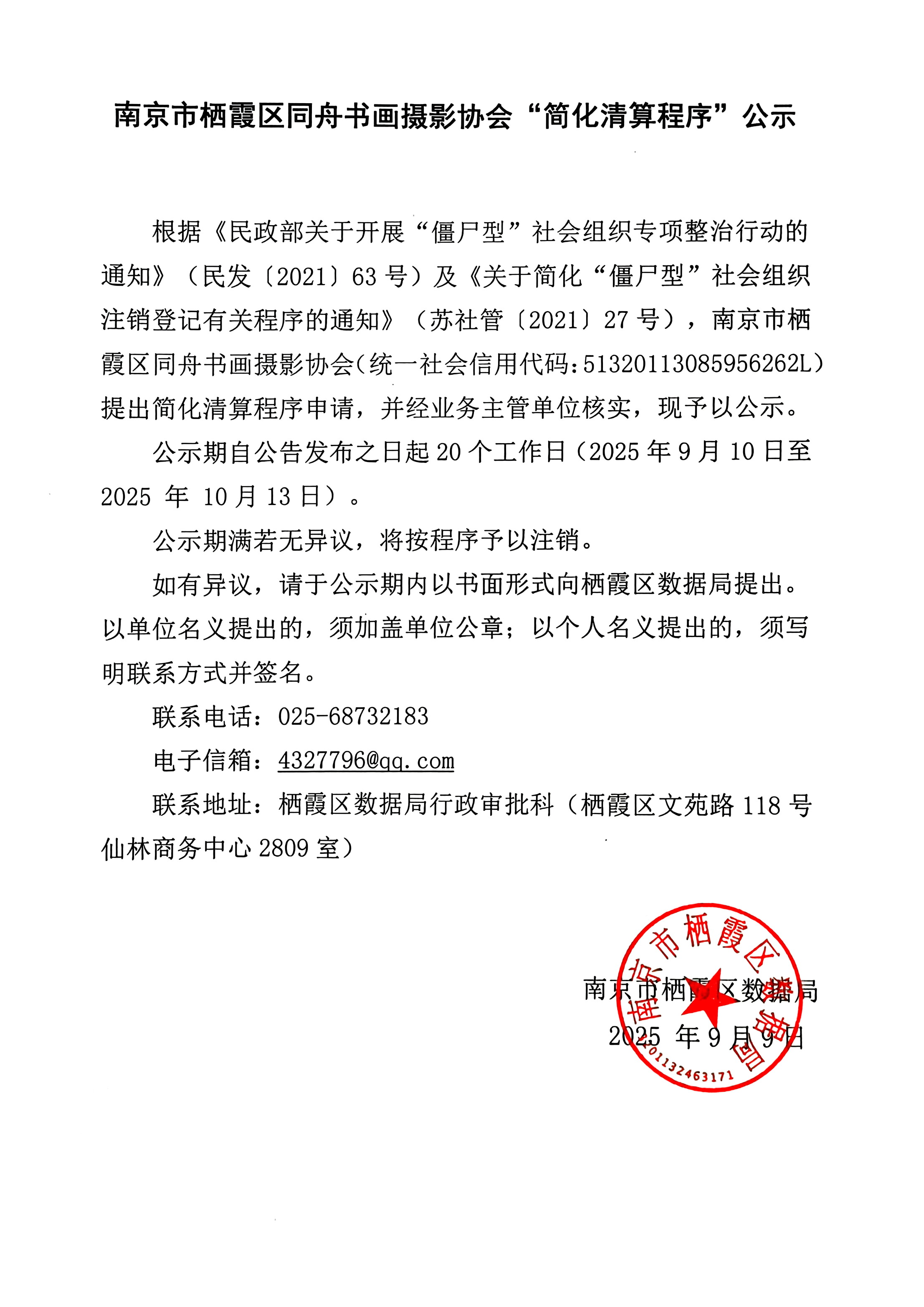 南京市栖霞区同舟书画摄影协会“简化清算程序”公示