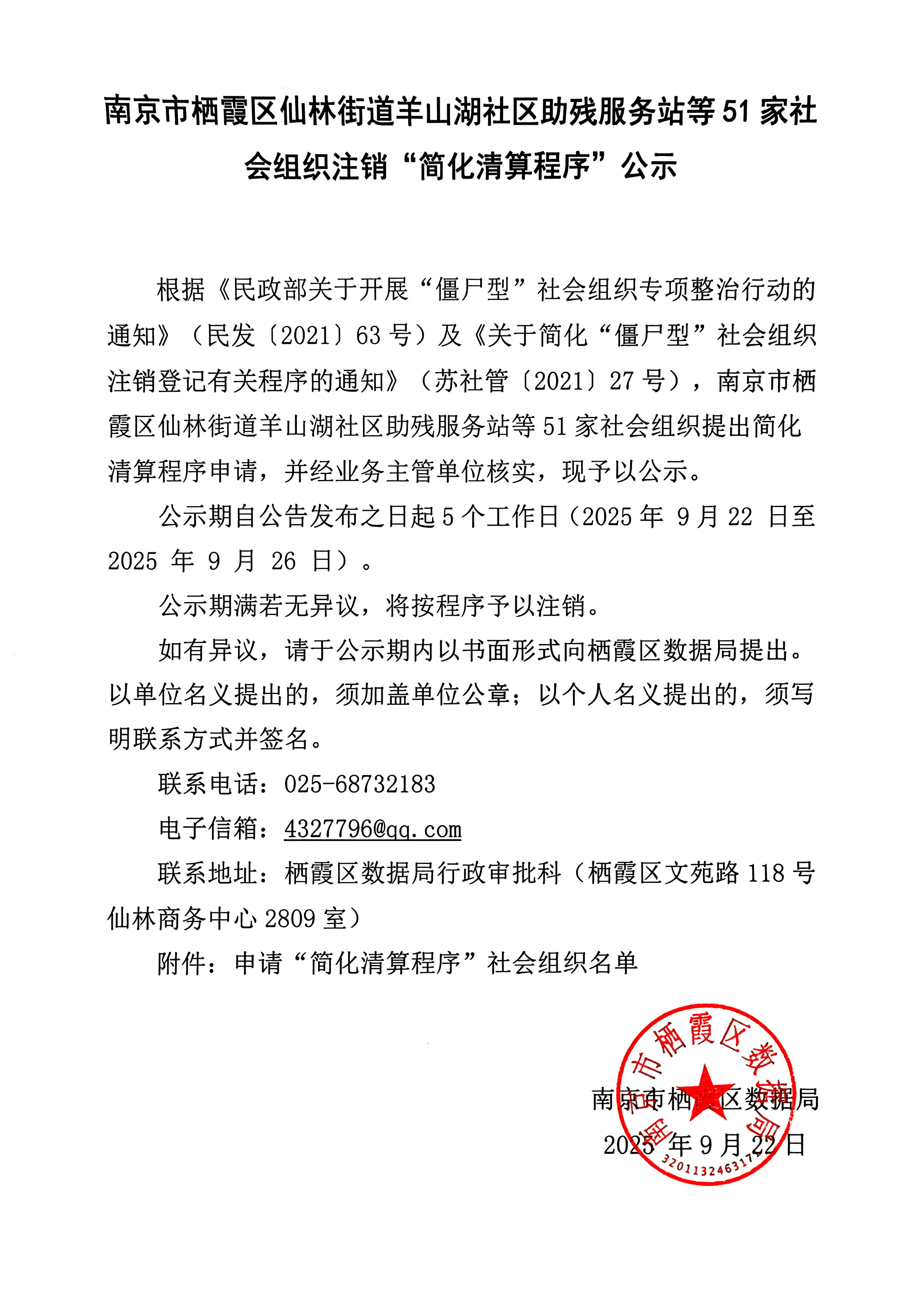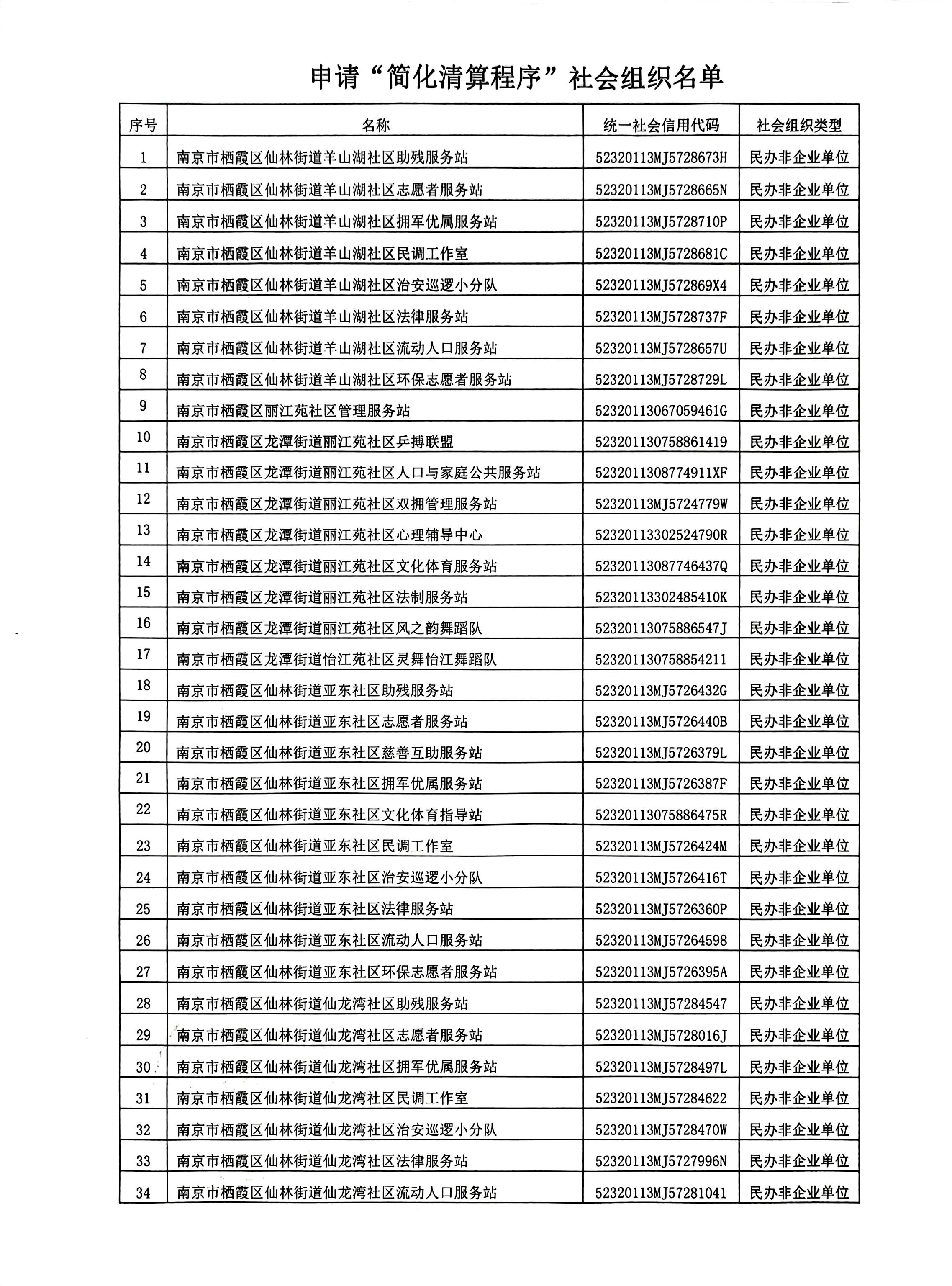 南京市栖霞区仙林街道羊山湖社区助残服务站等51家社会组织注销“简化清算程序”公示
