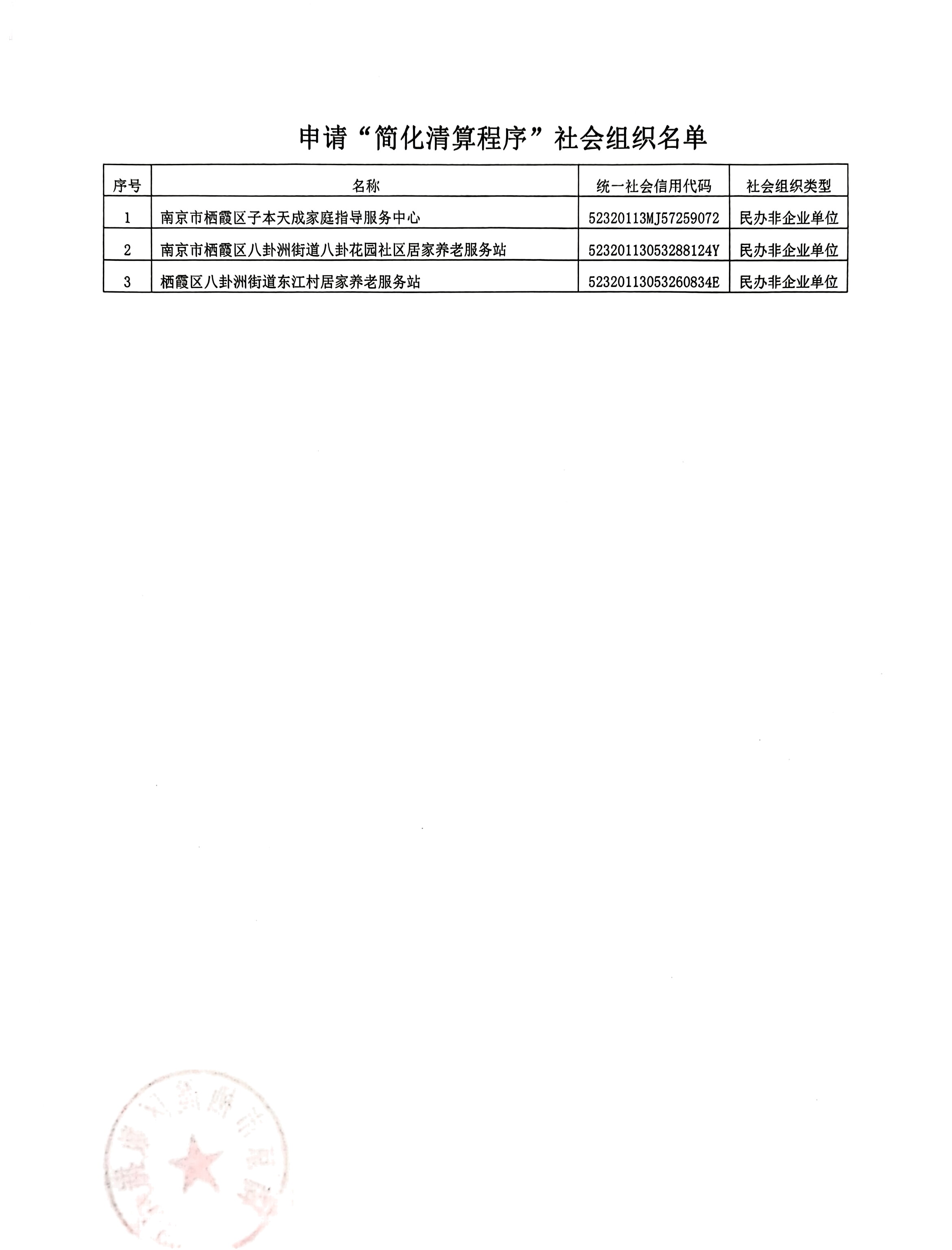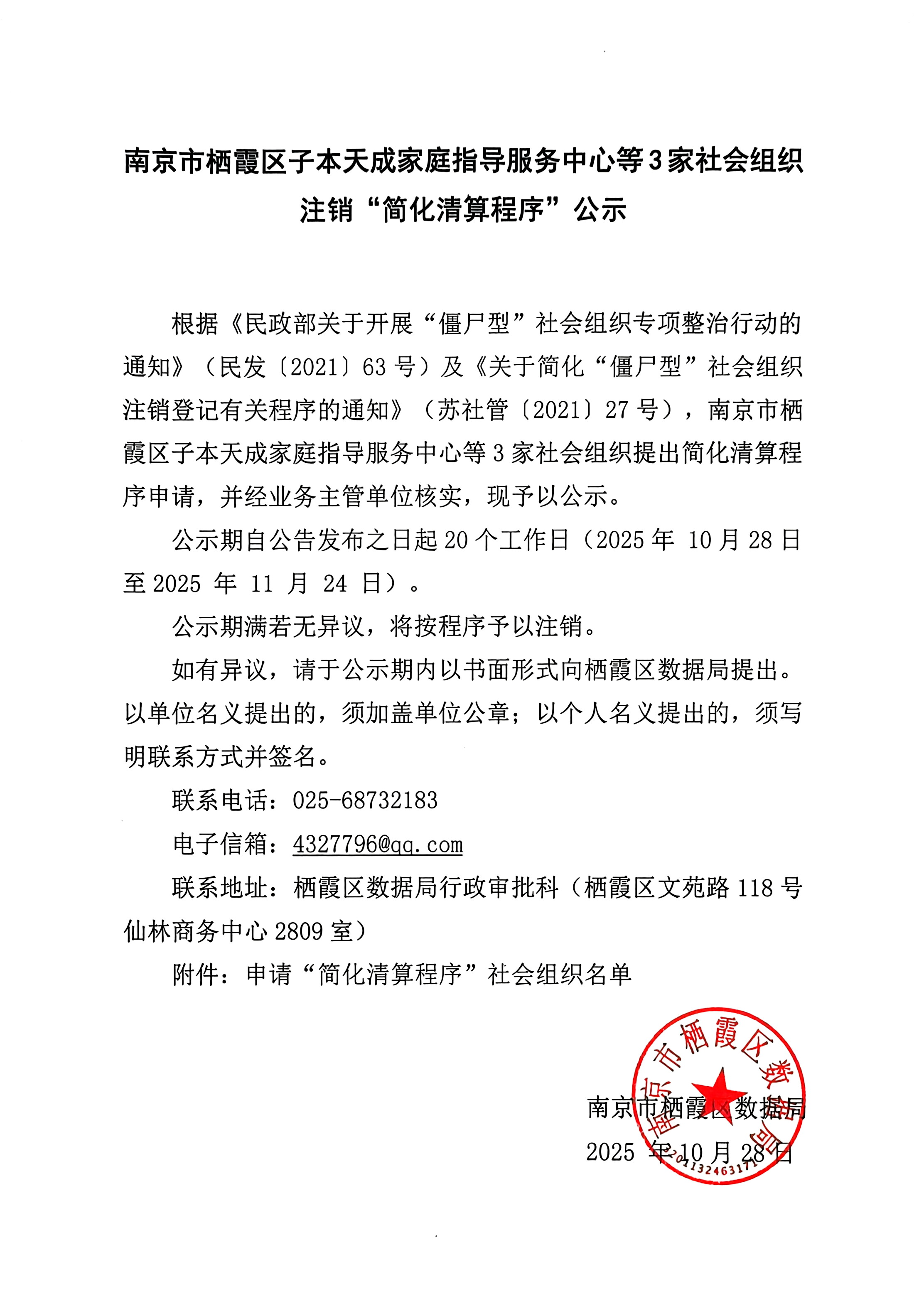 南京市栖霞区子本天成家庭指导服务中心等3家社会组织注销“简化清算程序”公示