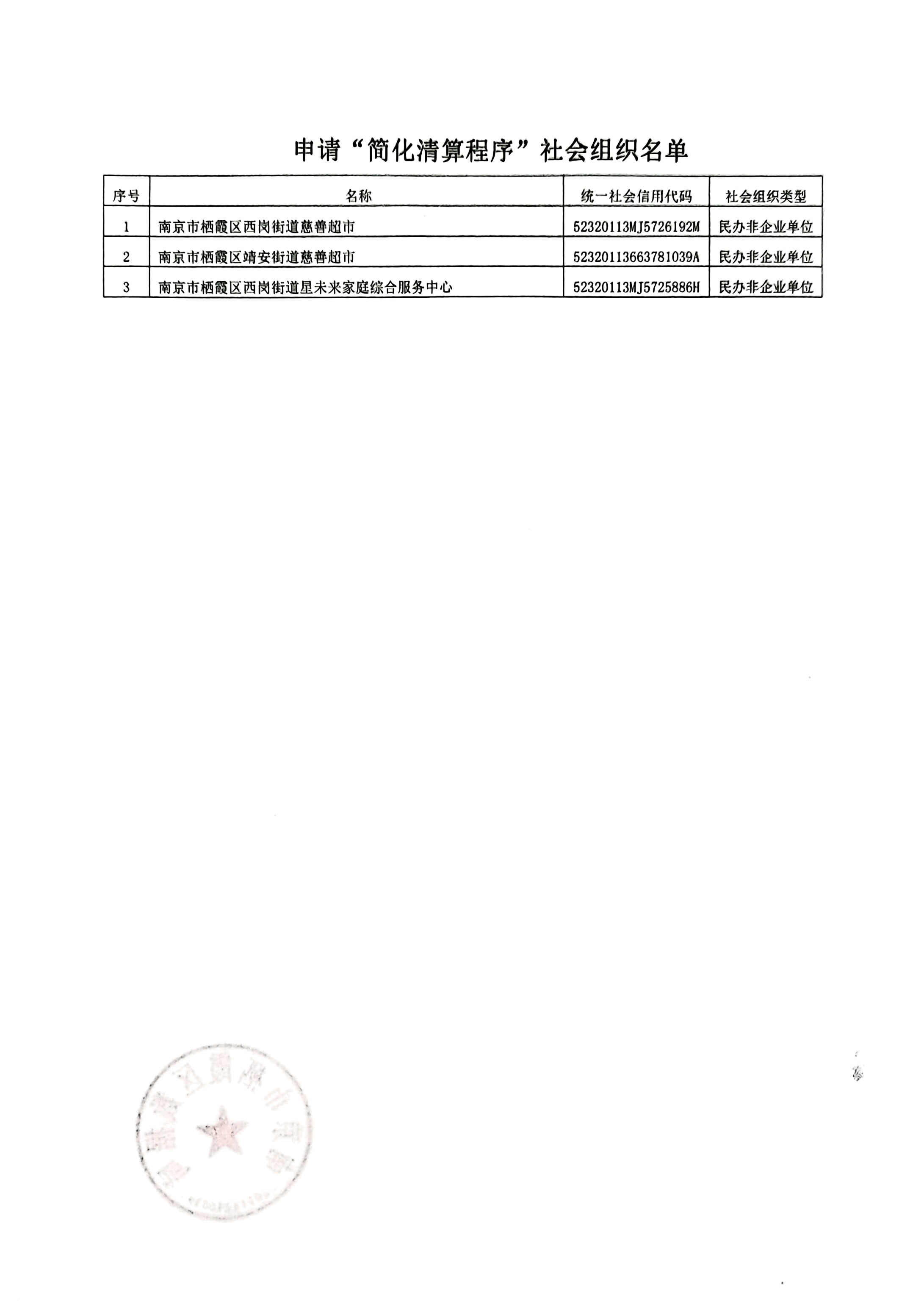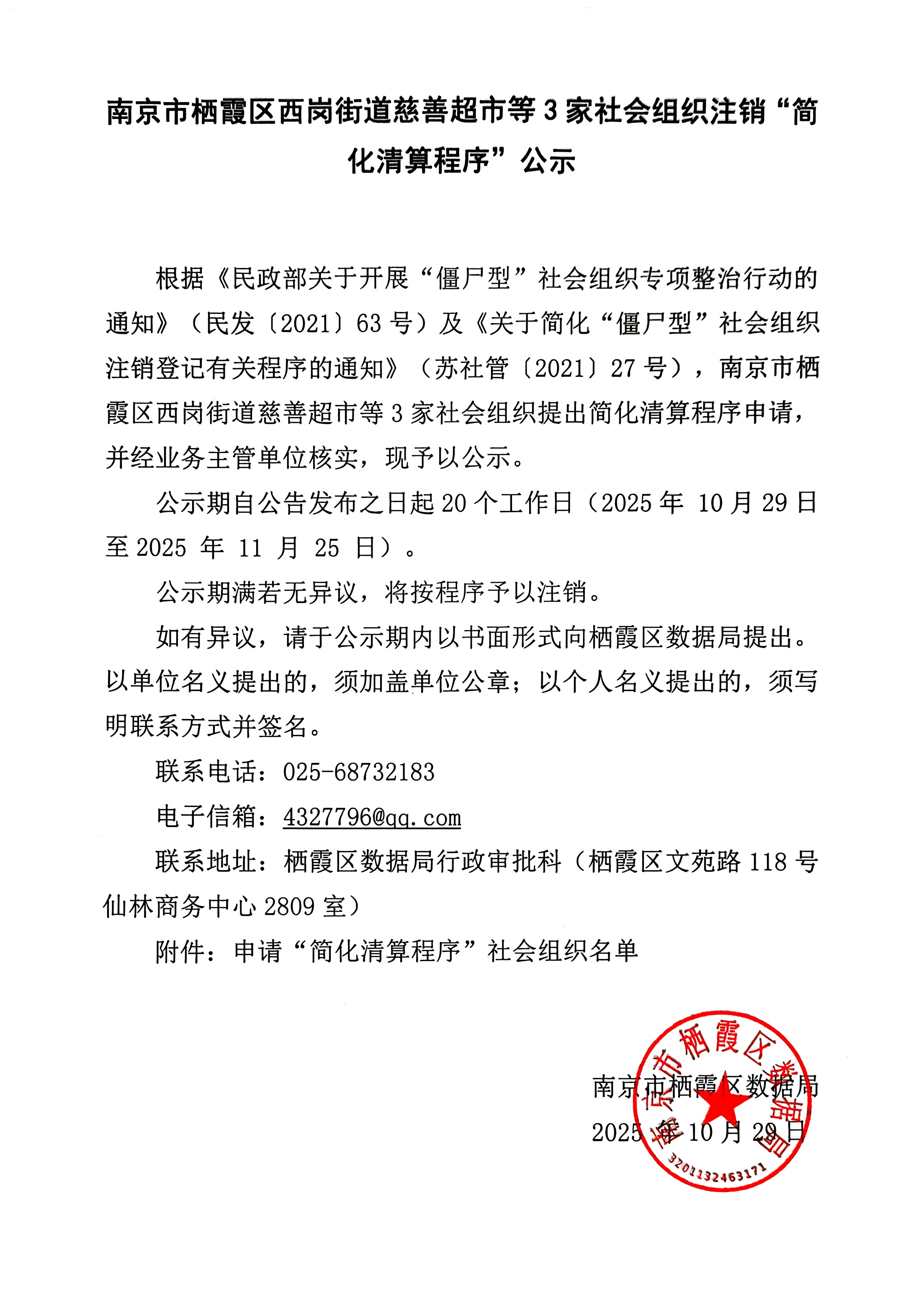 南京市栖霞区西岗街道慈善超市等3家社会组织注销“简化清算程序”公示