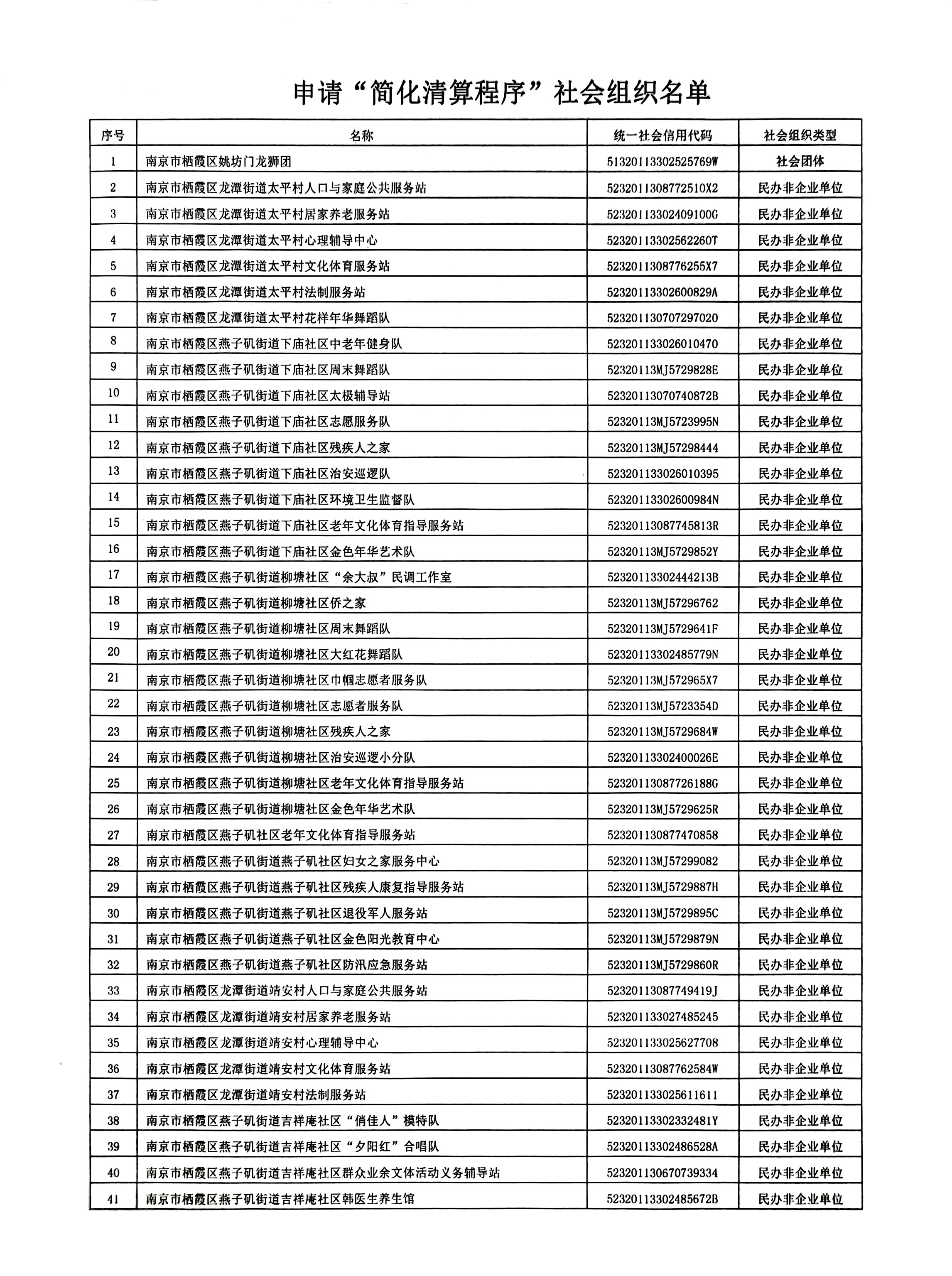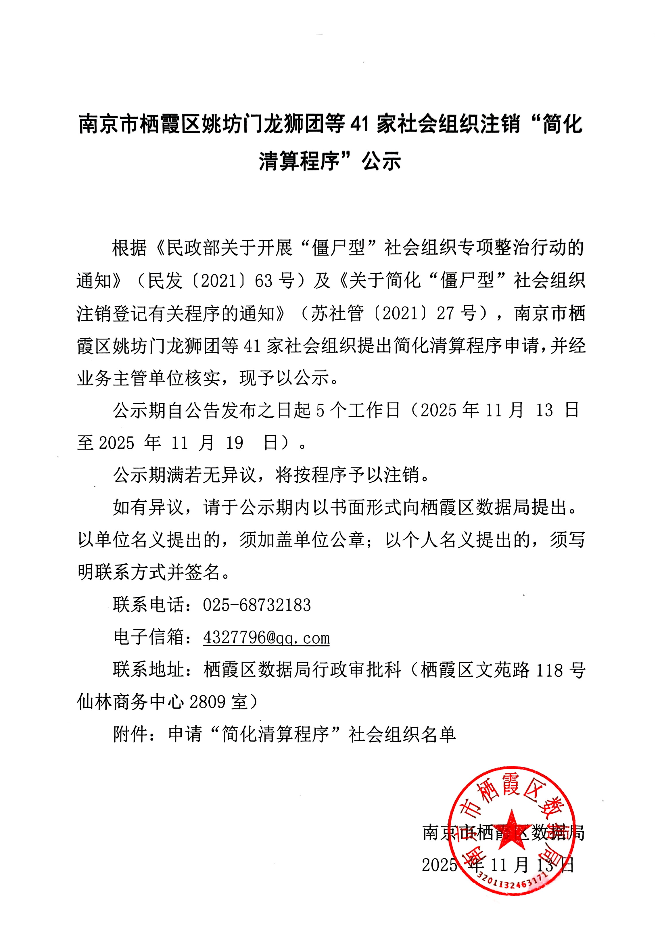 南京市栖霞区姚坊门龙狮团等41家社会组织注销“简化清算程序”公示