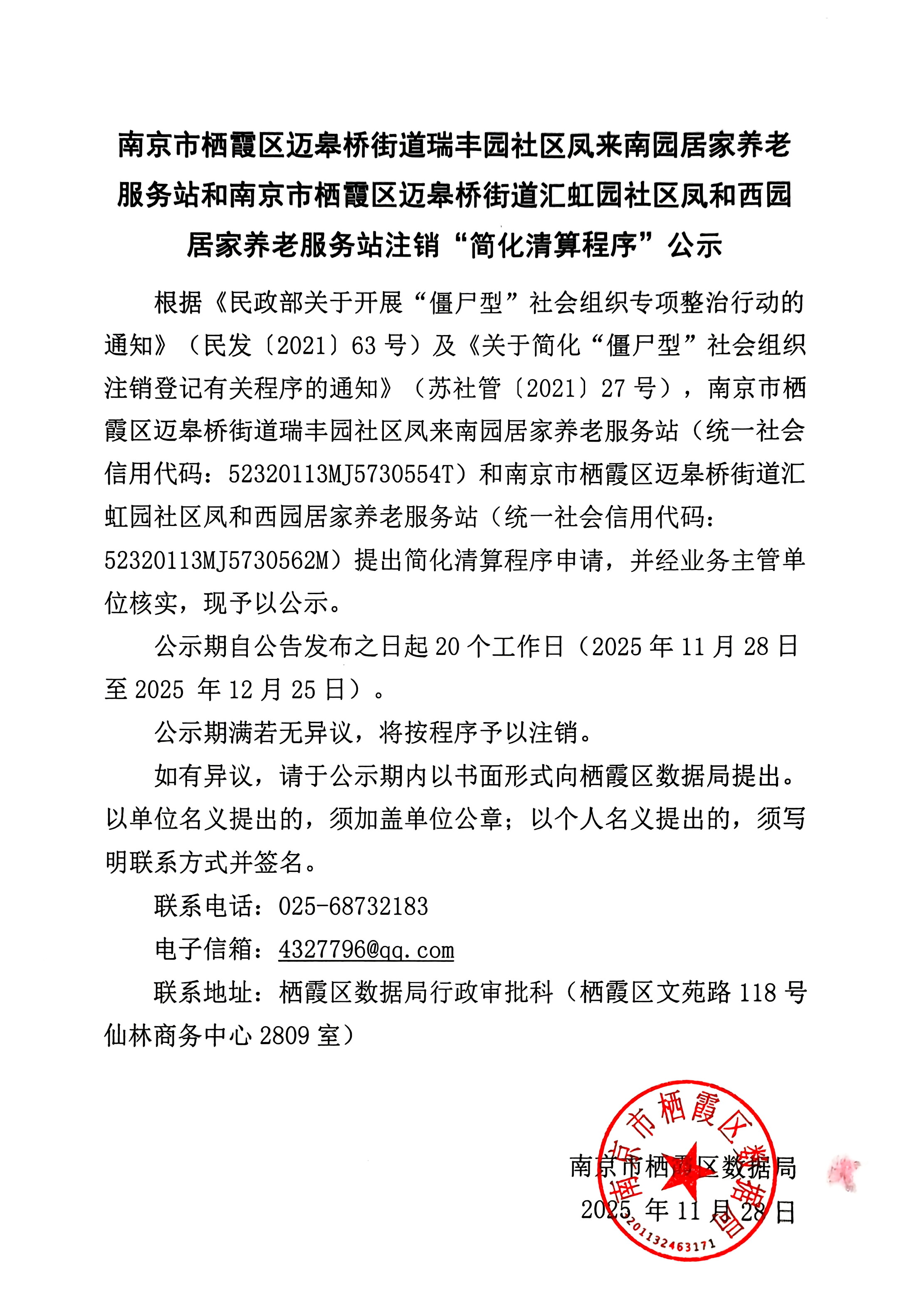 南京市栖霞区迈皋桥街道瑞丰园社区凤来南园居家养老服务站和南京市栖霞区迈皋桥街道汇虹园社区凤和西园居家养老服务站注销“简化清算程序”公示
