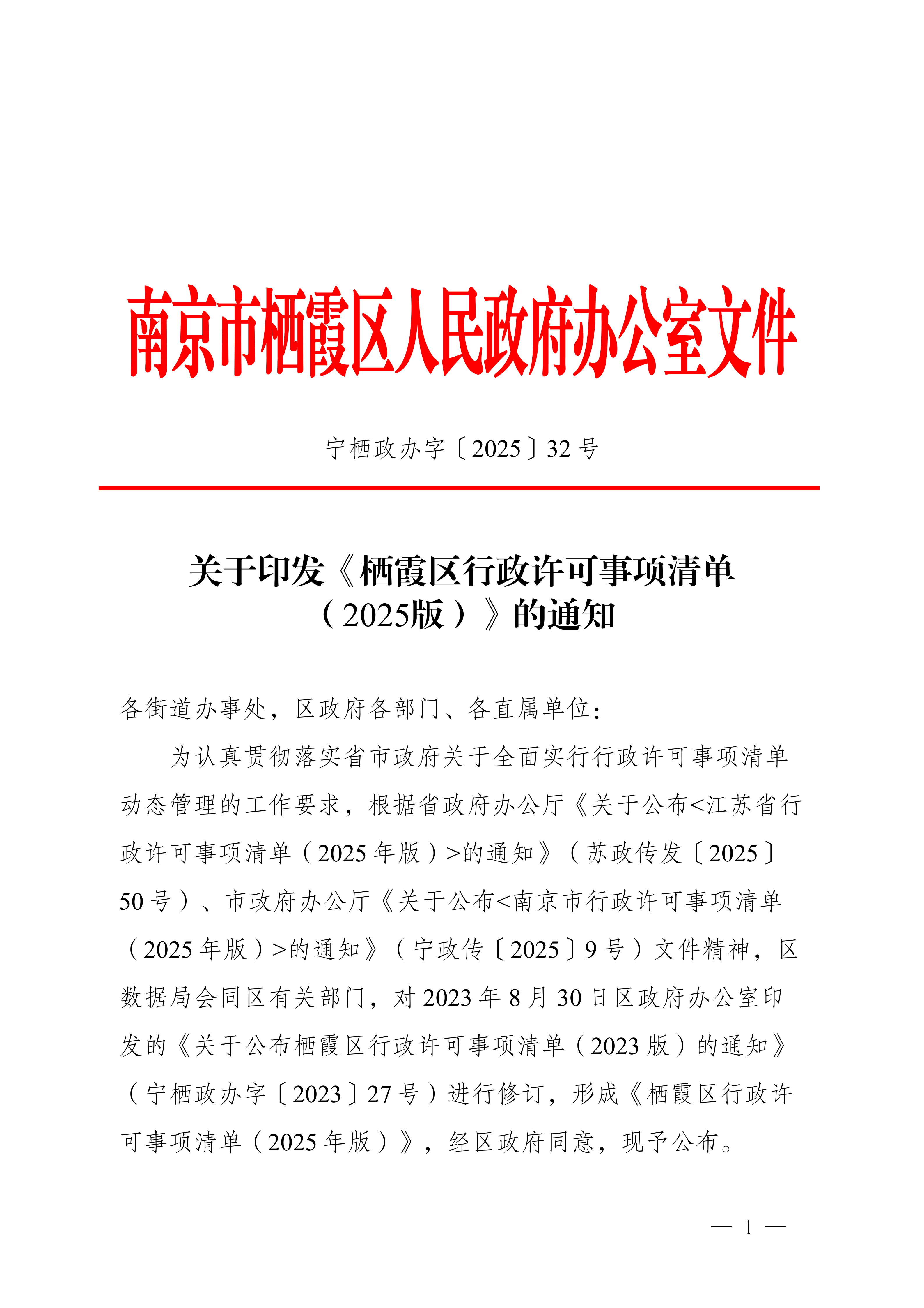 宁栖政办字〔2025〕32号 关于印发《栖霞区行政许可事项清单(2025版)》的通知