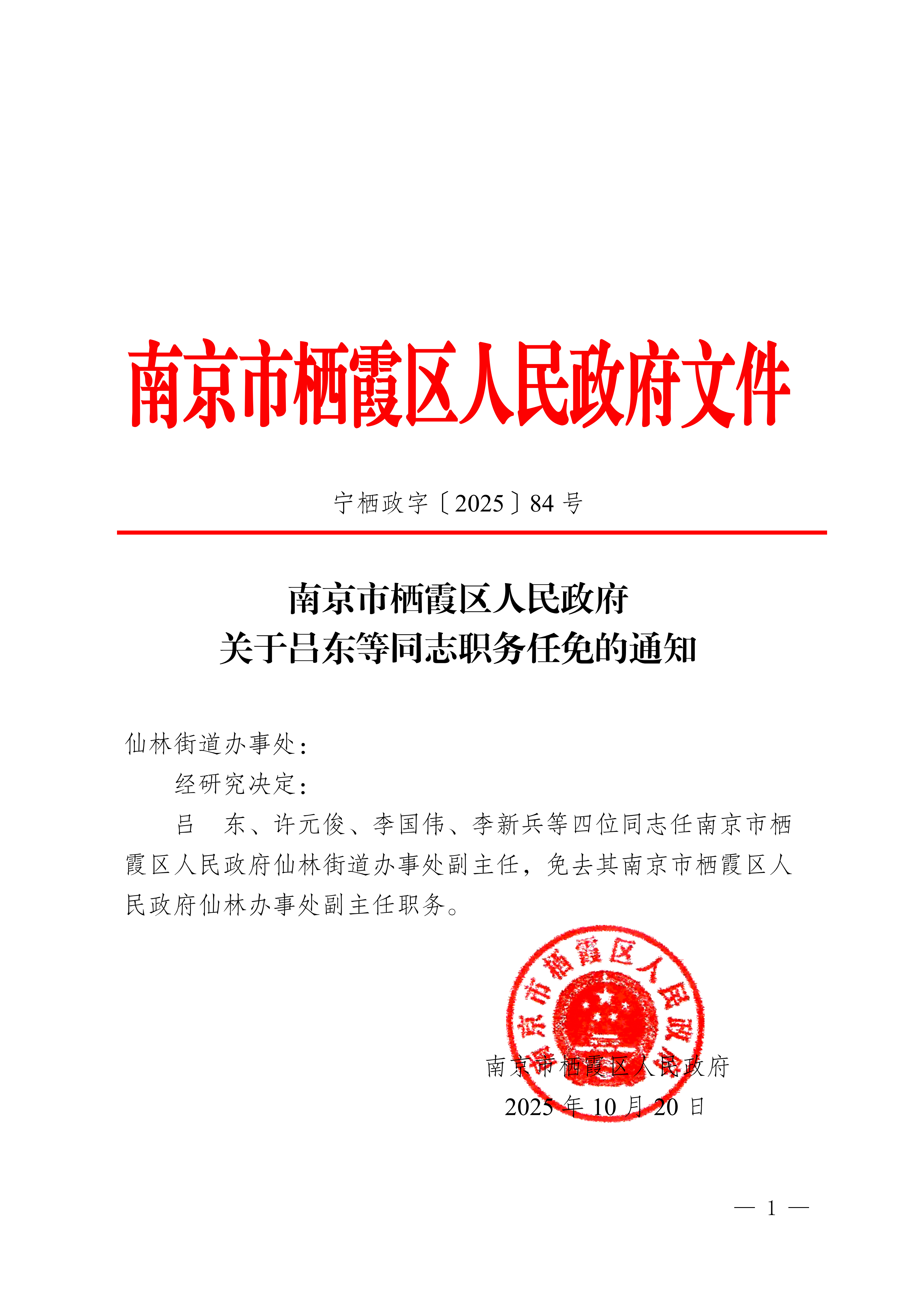 宁栖政字〔2025〕84号 南京市栖霞区人民政府关于吕东等同志职务任免的通知
